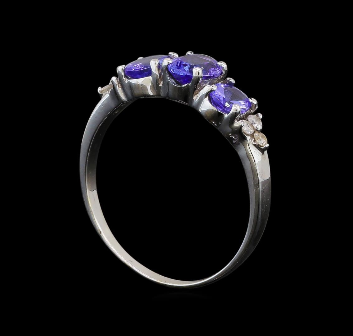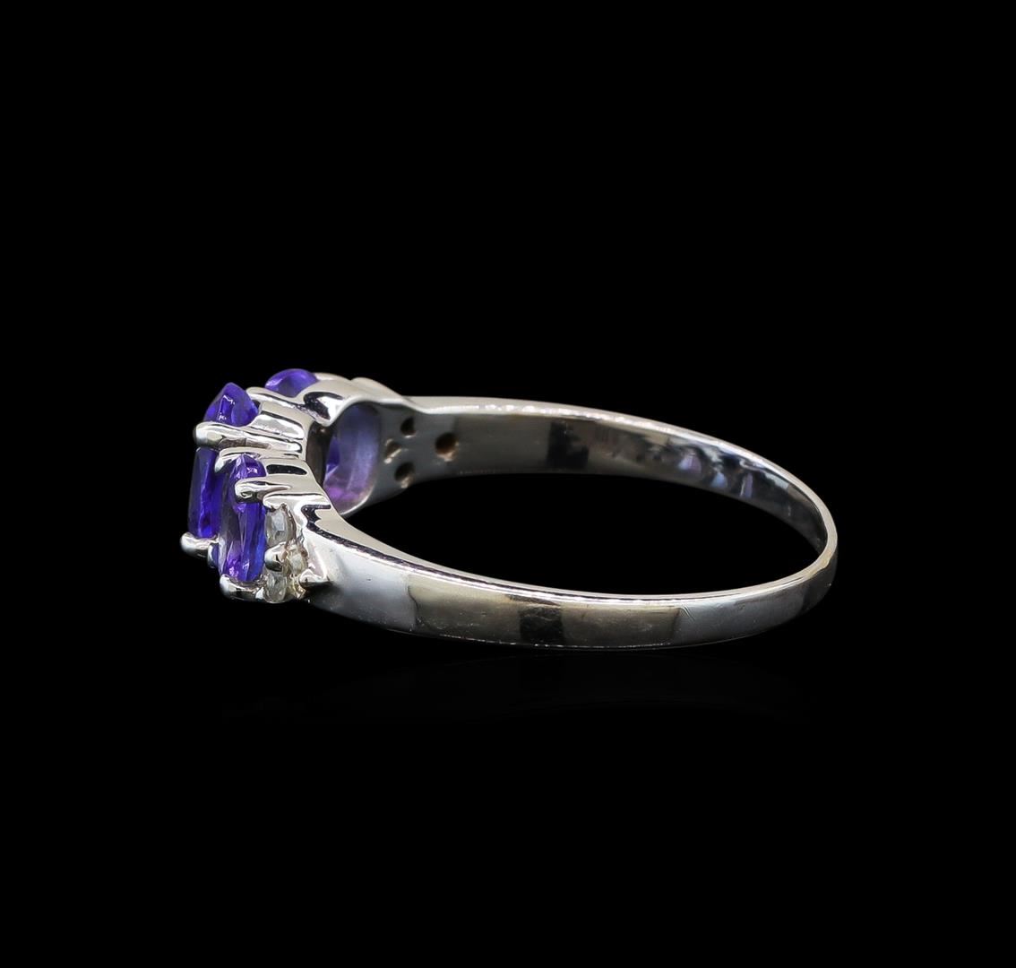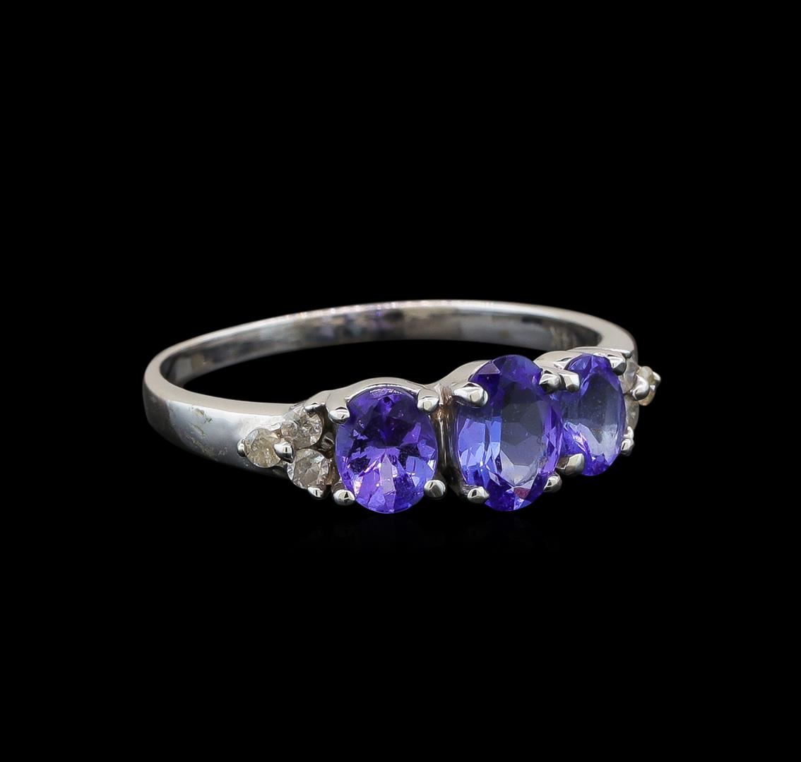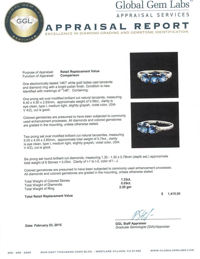 One electronically tested 14KT white gold ladies cast tanzanite and diamond ring with a bright polish finish. Identified with markings of "14K". Condition is new. Containing: One prong set oval modified brilliant cut natural tanzanite, measuring 6.40 x 4.50 x 2.93mm, approximate weight of 0.59ct., clarity is eye clean, type I, medium light, slightly grayish, violet color, (GIA V 4/2), cut is good. Two prong set oval modified brilliant cut natural tanzanites, measuring 5.00 x 4.00 x 2.60mm, approximate total weight of 0.74ct., clarity is eye clean, type I, medium light, slightly grayish, violet color, (GIA V 4/2), cut is good. Six prong set round brilliant cut diamonds, measuring 1.30 - 1.30 x 0.78mm (depth est.) approximate total weight of 6 Stones = 0.05ct. Clarity: I-1 to I-2. Color: I - J. Colored gemstones are presumed to have been subjected to commonly used enhancement processes. Colored gemstones are presumed to have been subjected to commonly used enhancement processes. All diamonds and colored gemstones are graded in the mounting, unless otherwise stated. All diamonds and colored gemstones are graded in the mounting, unless otherwise stated. Total Weight of Colored Stones 1.33ct. Total Weight of Diamonds 0.05ct. Total Weight of Ring 2.20 grams. GGL Appraised.