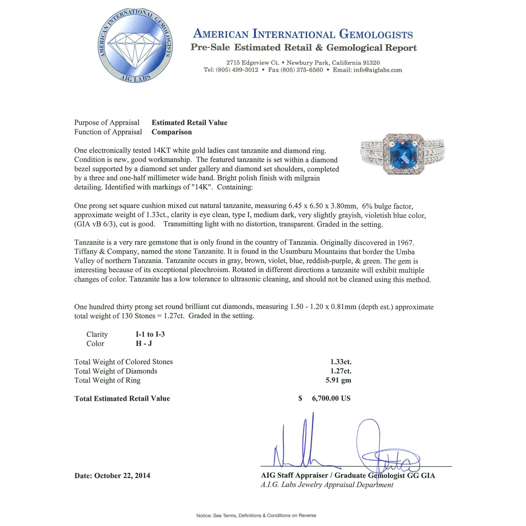 One electronically tested 14KT white gold ladies cast tanzanite and diamond ring. The featured tanzanite is set within a diamond bezel supported by a diamond set under gallery and diamond set shoulders, completed by a three and one-half millimeter wide band. Bright polish finish with milgrain detailing. Identified with markings of 14K. Condition is new, good workmanship. Containing: One prong set square cushion mixed cut natural tanzanite, measuring 6.45 x 6.50 x 3.80mm, 6% bulge factor, approximate weight of 1.33ct., clarity is eye clean, type I, medium dark, very slightly grayish, violetish blue color, (GIA vB 6/3), cut is good. Transmitting light with no distortion, transparent. Graded in the setting. Tanzanite is a very rare gemstone that is only found in the country of Tanzania. Originally discovered in 1967. Tiffany & Company, named the stone Tanzanite. It is found in the Usumburu Mountains that border the Umba Valley of northern Tanzania. Tanzanite occurs in gray, brown, violet, blue, reddish-purple, & green. The gem is interesting because of its exceptional pleochroism. Rotated in different directions a tanzanite will exhibit multiple changes of color. Tanzanite has a low tolerance to ultrasonic cleaning, and should not be cleaned using this method. One Hundred Thirty prong set round brilliant cut diamonds, measuring 1.50 - 1.20 x 0.81mm (depth est.) approximate total weight of 130 Stones = 1.27ct. Graded in the setting. Clarity: I-1 to I-3. Color: H - J. Total Weight of Colored Stones 1.33ct. Total Weight of Diamonds 1.27ct. Total Weight of Ring 5.91 grams. AIG Appraised.