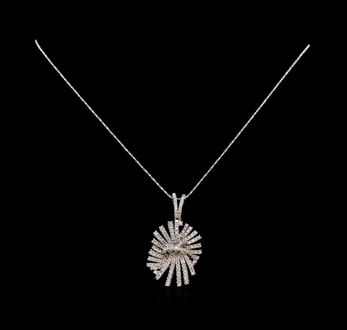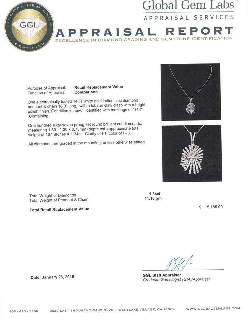 One electronically tested 14KT white gold ladies cast diamond pendant & chain 18.0" long, with a lobster claw clasp with a bright polish finish. Identified with markings of "14K". Condition is new. Containing: One Hundred Sixty-Seven prong set round brilliant cut diamonds, measuring 1.30 - 1.30 x 0.78mm (depth est.) approximate total weight of 167 Stones = 1.34ct. Clarity: I-1. Color: I - J. All diamonds are graded in the mounting, unless otherwise stated. Total Weight of Diamonds 1.34ct. Total Weight of Pendant & Chain 11.10 grams. GGL Appraised.
