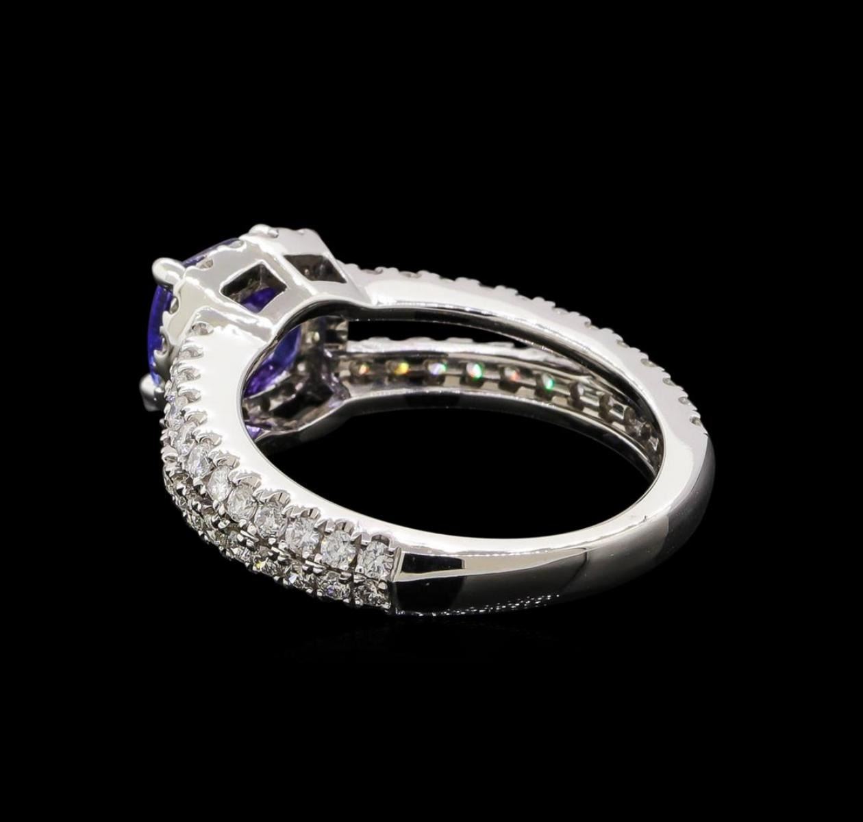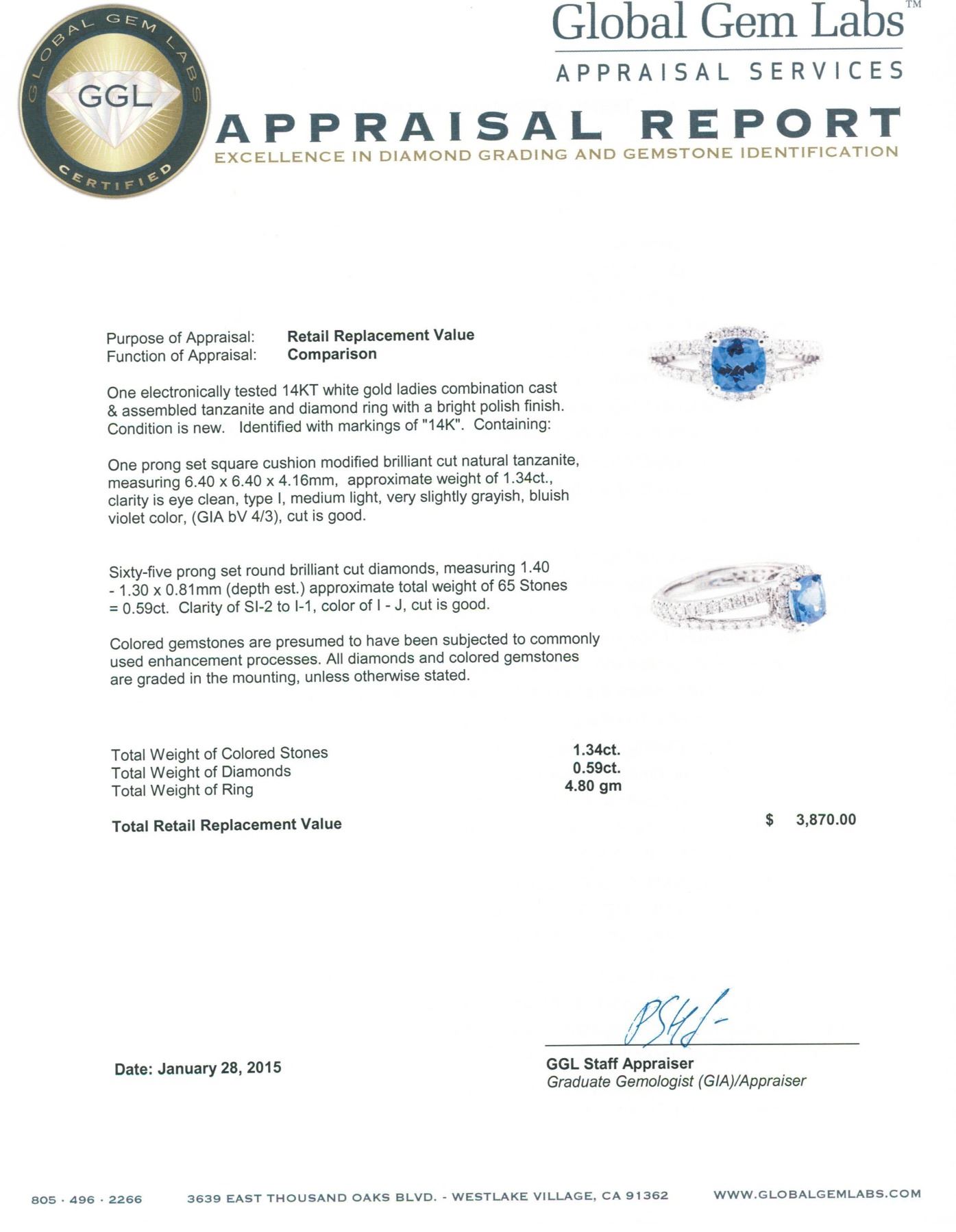 One electronically tested 14KT white gold ladies combination cast & assembled tanzanite and diamond ring with a bright polish finish. Identified with markings of "14K". Condition is new. Containing: One prong set square cushion modified brilliant cut natural tanzanite, measuring 6.40 x 6.40 x 4.16mm, approximate weight of 1.34ct., clarity is eye clean, type I, medium light, very slightly grayish, bluish violet color, (GIA bV 4/3), cut is good. Sixty-Five prong set round brilliant cut diamonds, measuring 1.40 - 1.30 x 0.81mm (depth est.) approximate total weight of 65 Stones = 0.59ct. Clarity: SI-2 to I-1. Color: I - J, Cut is Good. Colored gemstones are presumed to have been subjected to commonly used enhancement processes. All diamonds and colored gemstones are graded in the mounting, unless otherwise stated. Total Weight of Colored Stones 1.34ct. Total Weight of Diamonds 0.59ct. Total Weight of Ring 4.80 grams. GGL Appraised.