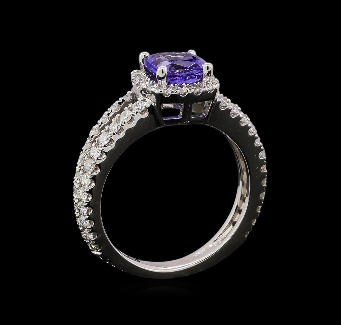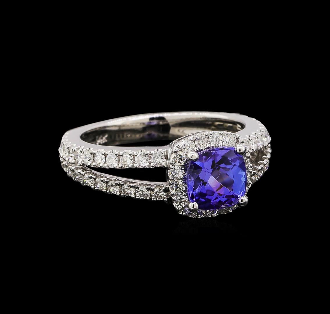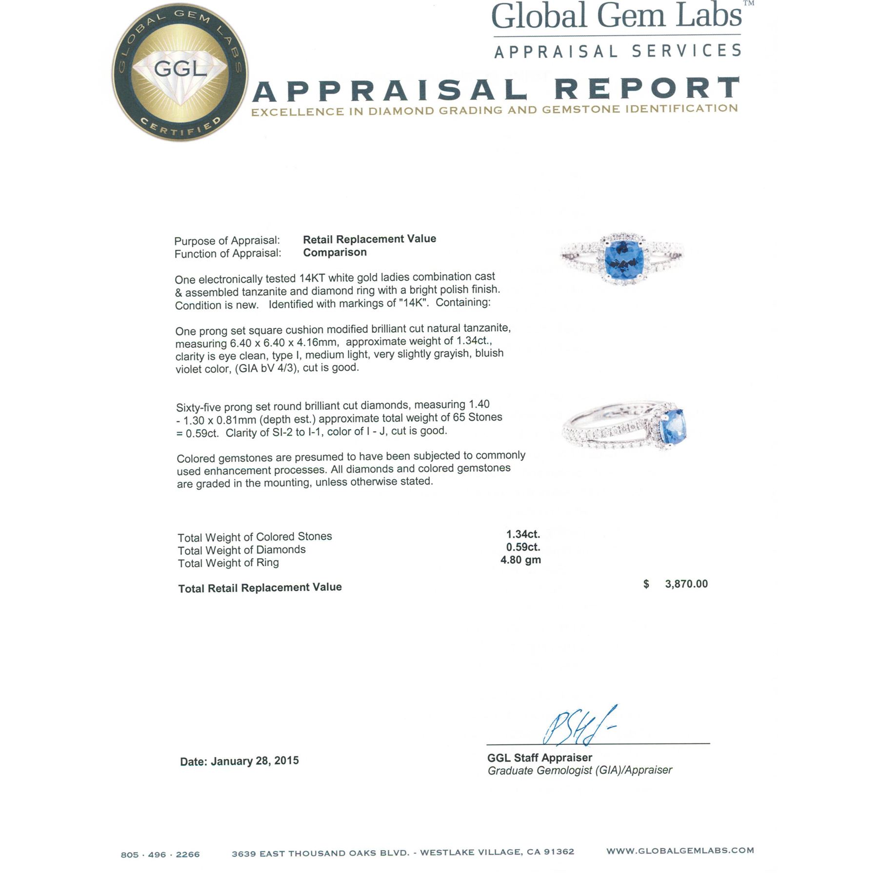 One electronically tested 14KT white gold ladies combination cast & assembled tanzanite and diamond ring with a bright polish finish. Identified with markings of "14K". Condition is new. Containing: One prong set square cushion modified brilliant cut natural tanzanite, measuring 6.40 x 6.40 x 4.16mm, approximate weight of 1.34ct., clarity is eye clean, type I, medium light, very slightly grayish, bluish violet color, (GIA bV 4/3), cut is good. Sixty-Five prong set round brilliant cut diamonds, measuring 1.40 - 1.30 x 0.81mm (depth est.) approximate total weight of 65 Stones = 0.59ct. Clarity: SI-2 to I-1. Color: I - J, Cut is Good. Colored gemstones are presumed to have been subjected to commonly used enhancement processes. All diamonds and colored gemstones are graded in the mounting, unless otherwise stated. Total Weight of Colored Stones 1.34ct. Total Weight of Diamonds 0.59ct. Total Weight of Ring 4.80 grams. GGL Appraised.