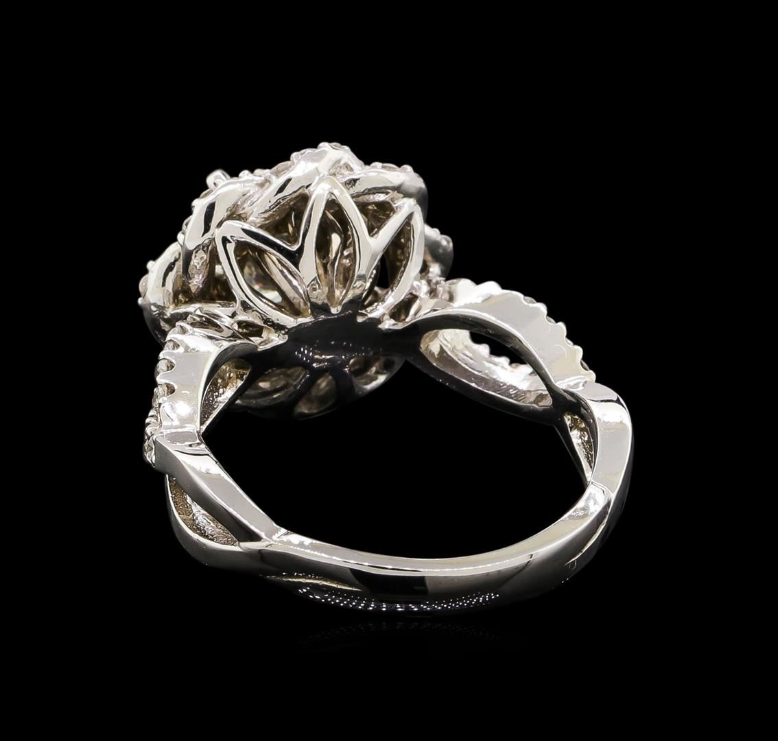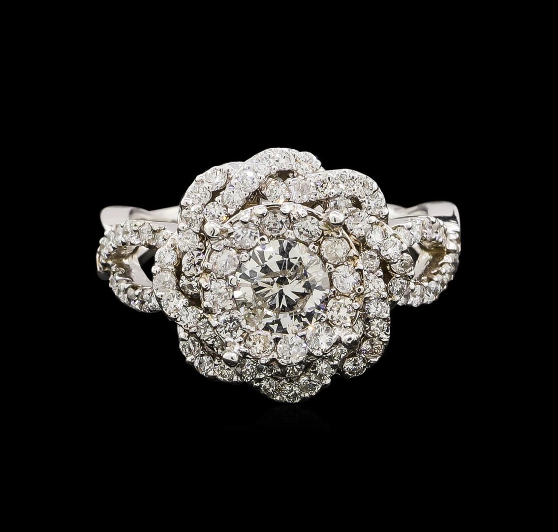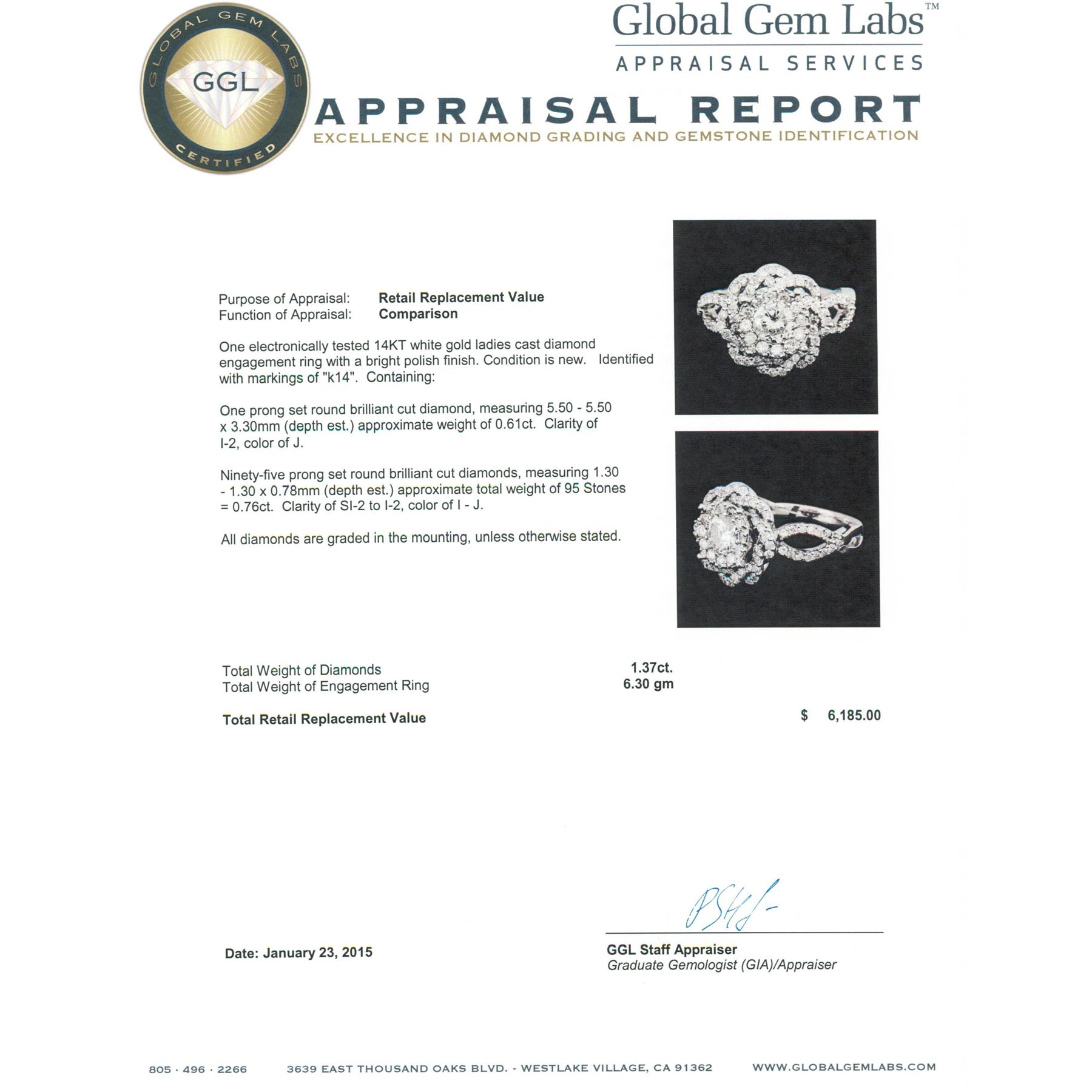 One electronically tested 14KT white gold ladies cast diamond engagement ring with a bright polish finish. Identified with markings of "k14". Condition is new. Containing: One prong set round brilliant cut diamond, measuring 5.50 - 5.50 x 3.30mm (depth est.) approximate weight of 0.61ct. Clarity: I-2. Color: J. Ninety-Five prong set round brilliant cut diamonds, measuring 1.30 - 1.30 x 0.78mm (depth est.) approximate total weight of 95 Stones = 0.76ct. Clarity: SI-2 to I-2. Color: I - J. All diamonds are graded in the mounting, unless otherwise stated. Total Weight of Diamonds 1.37ct. Total Weight of Engagement Ring 6.30 grams. GGL Appraised.