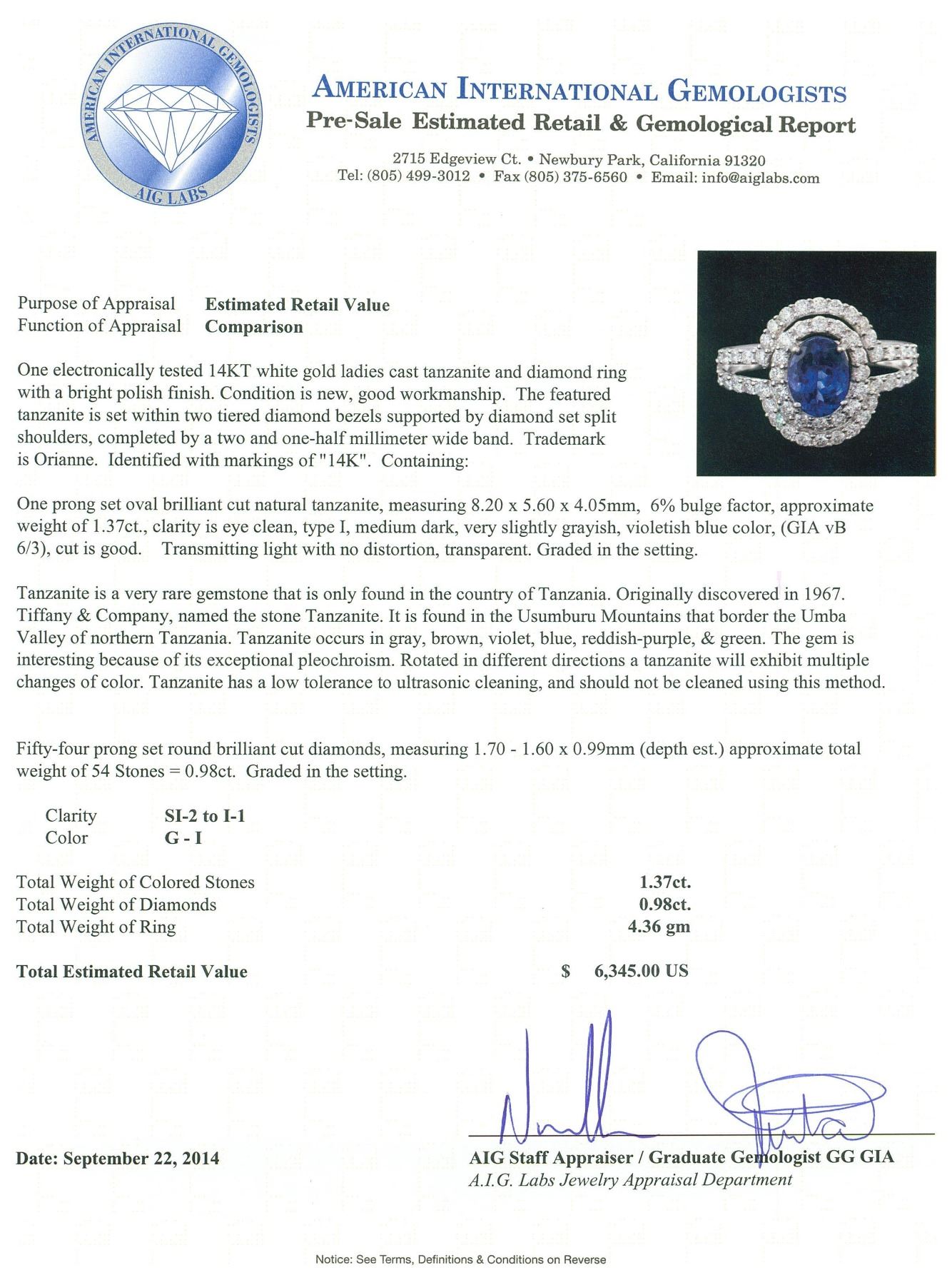 One electronically tested 14KT white gold ladies cast tanzanite and diamond ring with a bright polish finish. The featured tanzanite is set within two tiered diamond bezels supported by diamond set split shoulders, completed by a two and one-half millimeter wide band. Trademark is Orianne. Identified with markings of "14K". Condition is new, good workmanship. Containing: One prong set oval brilliant cut natural tanzanite, measuring 8.20 x 5.60 x 4.05mm, 6% bulge factor, approximate weight of 1.37ct., clarity is eye clean, type I, medium dark, very slightly grayish, violetish blue color, (GIA vB 6/3), cut is good. Transmitting light with no distortion, transparent. Graded in the setting. Tanzanite is a very rare gemstone that is only found in the country of Tanzania. Originally discovered in 1967. Tiffany & Company, named the stone Tanzanite. It is found in the Usumburu Mountains that border the Umba Valley of northern Tanzania. Tanzanite occurs in gray, brown, violet, blue, reddish-purple, & green. The gem is interesting because of its exceptional pleochroism. Rotated in different directions a tanzanite will exhibit multiple changes of color. Tanzanite has a low tolerance to ultrasonic cleaning, and should not be cleaned using this method. Fifty-Four prong set round brilliant cut diamonds, measuring 1.70 - 1.60 x 0.99mm (depth est.) approximate total weight of 54 Stones = 0.98ct. Graded in the setting. Clarity: SI-2 to I-1. Color: G - I. Total Weight of Colored Stones 1.37ct. Total Weight of Diamonds 0.98ct. Total Weight of Ring 4.36 grams. AIG Appraised at $6,345.00.
