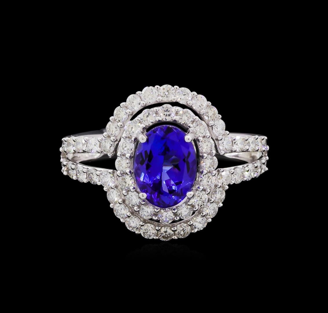 One electronically tested 14KT white gold ladies cast tanzanite and diamond ring with a bright polish finish. The featured tanzanite is set within two tiered diamond bezels supported by diamond set split shoulders, completed by a two and one-half millimeter wide band. Trademark is Orianne. Identified with markings of "14K". Condition is new, good workmanship. Containing: One prong set oval brilliant cut natural tanzanite, measuring 8.20 x 5.60 x 4.05mm, 6% bulge factor, approximate weight of 1.37ct., clarity is eye clean, type I, medium dark, very slightly grayish, violetish blue color, (GIA vB 6/3), cut is good. Transmitting light with no distortion, transparent. Graded in the setting. Tanzanite is a very rare gemstone that is only found in the country of Tanzania. Originally discovered in 1967. Tiffany & Company, named the stone Tanzanite. It is found in the Usumburu Mountains that border the Umba Valley of northern Tanzania. Tanzanite occurs in gray, brown, violet, blue, reddish-purple, & green. The gem is interesting because of its exceptional pleochroism. Rotated in different directions a tanzanite will exhibit multiple changes of color. Tanzanite has a low tolerance to ultrasonic cleaning, and should not be cleaned using this method. Fifty-Four prong set round brilliant cut diamonds, measuring 1.70 - 1.60 x 0.99mm (depth est.) approximate total weight of 54 Stones = 0.98ct. Graded in the setting. Clarity: SI-2 to I-1. Color: G - I. Total Weight of Colored Stones 1.37ct. Total Weight of Diamonds 0.98ct. Total Weight of Ring 4.36 grams. AIG Appraised.
