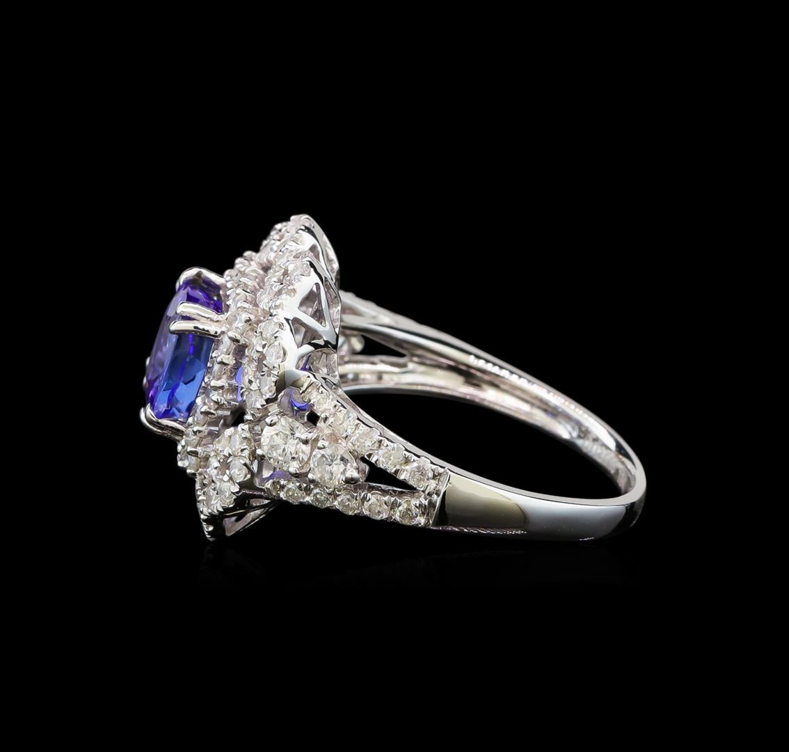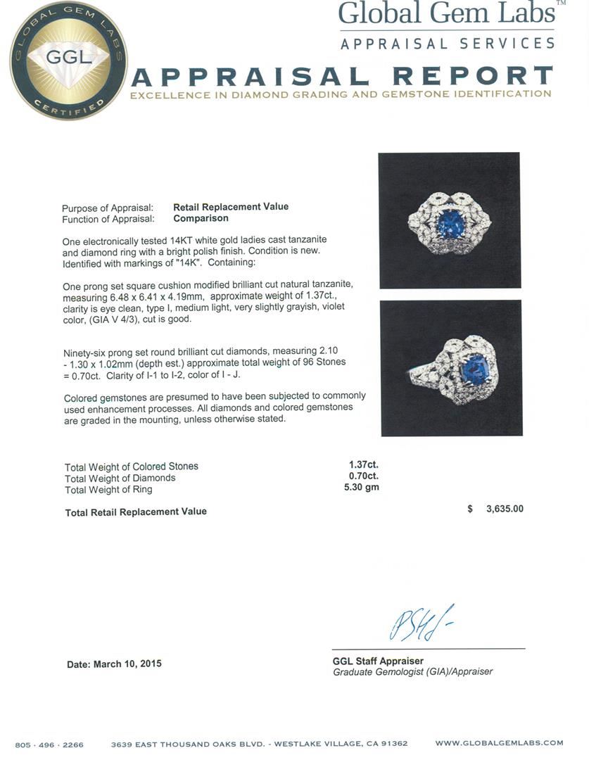 One electronically tested 14KT white gold ladies cast tanzanite and diamond ring with a bright polish finish. Identified with markings of "14K". Condition is new. Containing: One prong set square cushion modified brilliant cut natural tanzanite, measuring 6.48 x 6.41 x 4.19mm, approximate weight of 1.37ct., clarity is eye clean, type I, medium light, very slightly grayish, violet color, (GIA V 4/3), cut is good. Ninety-Six prong set round brilliant cut diamonds, measuring 2.10 - 1.30 x 1.02mm (depth est.) approximate total weight of 96 Stones = 0.70 ct. Clarity: I-1 to I-2. Color: I - J. Colored gemstones are presumed to have been subjected to commonly used enhancement processes. All diamonds and colored gemstones are graded in the mounting, unless otherwise stated. Total Weight of Colored Stones 1.37ct. Total Weight of Diamonds 0.70 ct. Total Weight of Ring 5.30 grams. GGL Appraised.