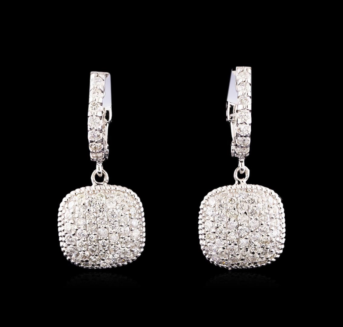 One pair electronically tested 14KT white gold ladies combination cast & assembled diamond earrings with hinged clip backs with a bright polish finish. Identified with markings of "K14". Condition is new. Containing: One Hundred Twelve prong set round brilliant cut diamonds, measuring 1.50 - 1.50 x 0.90mm (depth est.) approximate total weight of 112 Stones = 1.38ct. Clarity: SI-2 to I-1. Color: I - J, Cut is Good. All diamonds are graded in the mounting, unless otherwise stated. Total Weight of Diamonds 1.38ct. Total Weight of Earrings 6.00 grams. GGL Appraised.