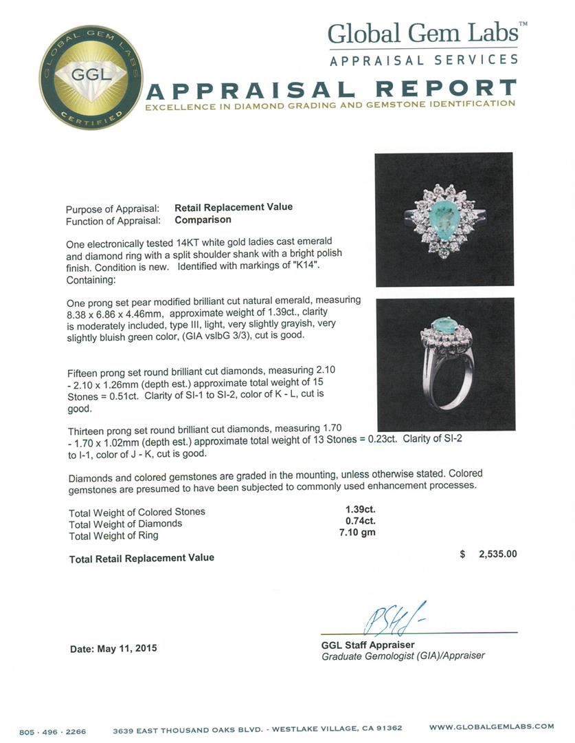 One electronically tested 14KT white gold ladies cast emerald and diamond ring with a split shoulder shank with a bright polish finish. Identified with markings of "K14". Condition is new. Containing: One prong set pear modified brilliant cut natural emerald, measuring 8.38 x 6.86 x 4.46mm, approximate weight of 1.39ct., clarity is moderately included, type III, light, very slightly grayish, very slightly bluish green color, (GIA vslbG 3/3), cut is good. Fifteen prong set round brilliant cut diamonds, measuring 2.10 - 2.10 x 1.26mm (depth est.) approximate total weight of 15 Stones = 0.51ct. Clarity: SI-1 to SI-2. Color: K - L, Cut is Good. Thirteen prong set round brilliant cut diamonds, measuring 1.70 - 1.70 x 1.02mm (depth est.) approximate total weight of 13 Stones = 0.23ct. Clarity: SI-2 to I-1. Color: J - K, Cut is Good. Diamonds and colored gemstones are graded in the mounting, unless otherwise stated. Colored gemstones are presumed to have been subjected to commonly used enhancement processes. Total Weight of Colored Stones 1.39ct. Total Weight of Diamonds 0.74ct. Total Weight of Ring 7.10 grams. GGL Appraised at $2,535.00.