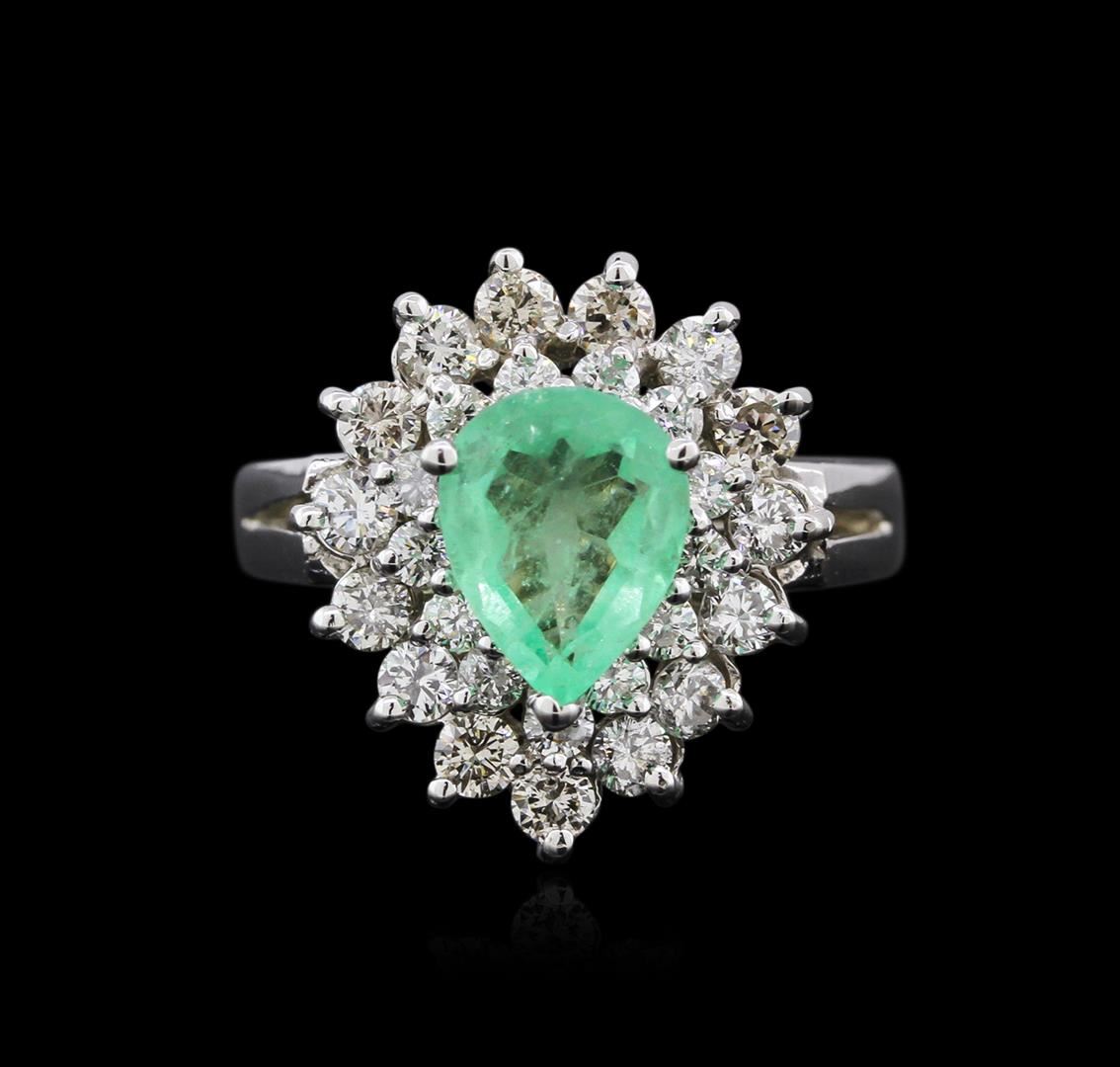 One electronically tested 14KT white gold ladies cast emerald and diamond ring with a split shoulder shank with a bright polish finish. Identified with markings of "K14". Condition is new. Containing: One prong set pear modified brilliant cut natural emerald, measuring 8.38 x 6.86 x 4.46mm, approximate weight of 1.39ct., clarity is moderately included, type III, light, very slightly grayish, very slightly bluish green color, (GIA vslbG 3/3), cut is good. Fifteen prong set round brilliant cut diamonds, measuring 2.10 - 2.10 x 1.26mm (depth est.) approximate total weight of 15 Stones = 0.51ct. Clarity: SI-1 to SI-2. Color: K - L, Cut is Good. Thirteen prong set round brilliant cut diamonds, measuring 1.70 - 1.70 x 1.02mm (depth est.) approximate total weight of 13 Stones = 0.23ct. Clarity: SI-2 to I-1. Color: J - K, Cut is Good. Diamonds and colored gemstones are graded in the mounting, unless otherwise stated. Colored gemstones are presumed to have been subjected to commonly used enhancement processes. Total Weight of Colored Stones 1.39ct. Total Weight of Diamonds 0.74ct. Total Weight of Ring 7.10 grams. GGL Appraised at $2,535.00.