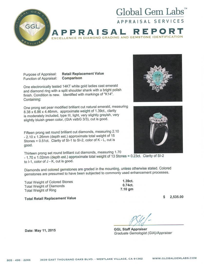 One electronically tested 14KT white gold ladies cast emerald and diamond ring with a split shoulder shank with a bright polish finish. Identified with markings of "K14". Condition is new. Containing: One prong set pear modified brilliant cut natural emerald, measuring 8.38 x 6.86 x 4.46mm, approximate weight of 1.39ct., clarity is moderately included, type III, light, very slightly grayish, very slightly bluish green color, (GIA vslbG 3/3), cut is good. Fifteen prong set round brilliant cut diamonds, measuring 2.10 - 2.10 x 1.26mm (depth est.) approximate total weight of 15 Stones = 0.51ct. Clarity: SI-1 to SI-2. Color: K - L, Cut is Good. Thirteen prong set round brilliant cut diamonds, measuring 1.70 - 1.70 x 1.02mm (depth est.) approximate total weight of 13 Stones = 0.23ct. Clarity: SI-2 to I-1. Color: J - K, Cut is Good. Diamonds and colored gemstones are graded in the mounting, unless otherwise stated. Colored gemstones are presumed to have been subjected to commonly used enhancement processes. Total Weight of Colored Stones 1.39ct. Total Weight of Diamonds 0.74ct. Total Weight of Ring 7.10 grams. GGL Appraised.