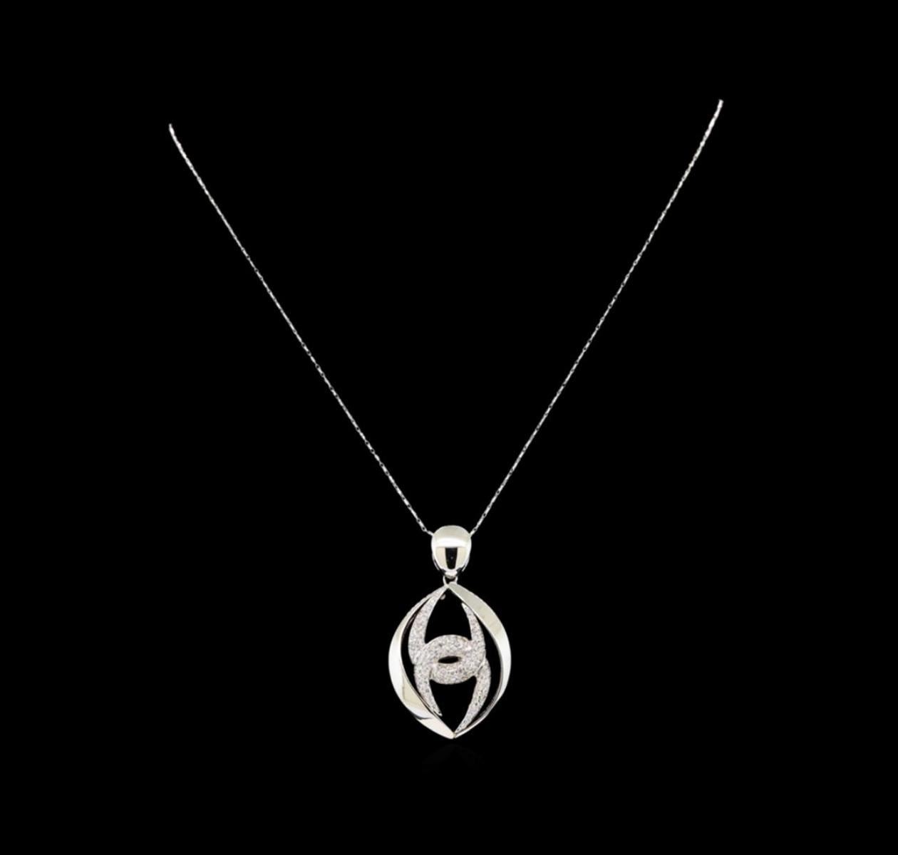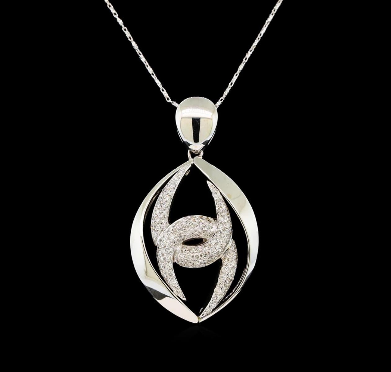One electronically tested 14KT white gold ladies cast & assembled diamond pendant with chain. The pendant features two intertwining diamond set "u" shapes set within mirroring white gold ribbons, completed by a white gold bail. The pendant is supported by an eighteen inch length 14KT white gold designer style chain, terminating in a lobster claw clasp. Identified with markings of "14K". Condition is new, good workmanship. Containing: Ninety-Six prong set round brilliant cut diamonds, measuring 1.60 - 1.50 x 0.93mm (depth est.) approximate total weight of 96 Stones = 1.40ct. Graded in the setting. Clarity: SI-1 to I-1. Color: H - J. Total Weight of Diamonds 1.40ct. Total Weight of Pendant With Chain 13.81 grams. AIG Appraised.