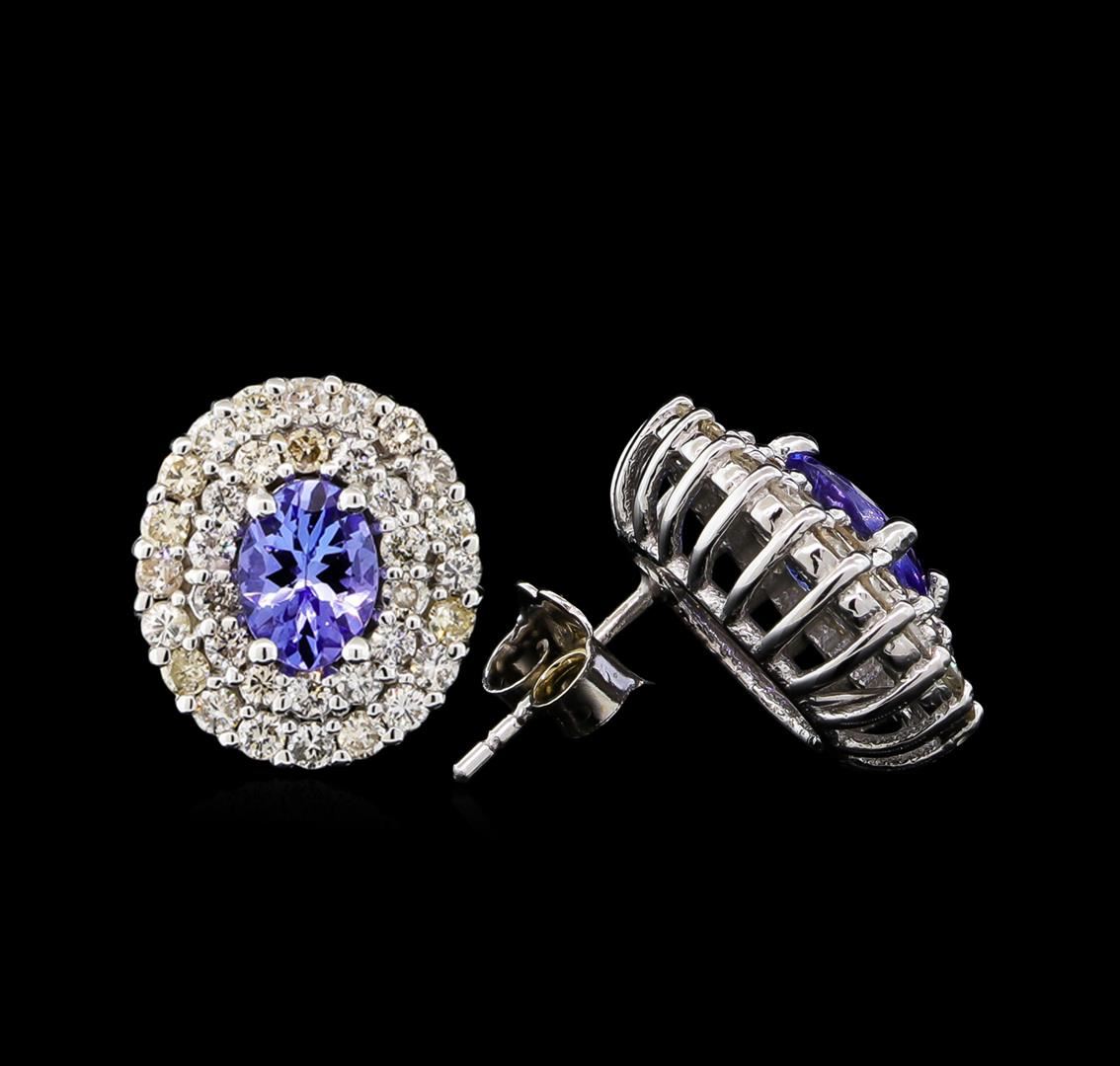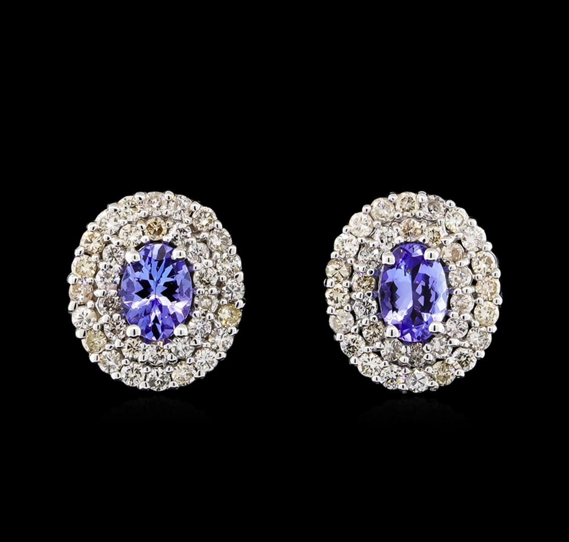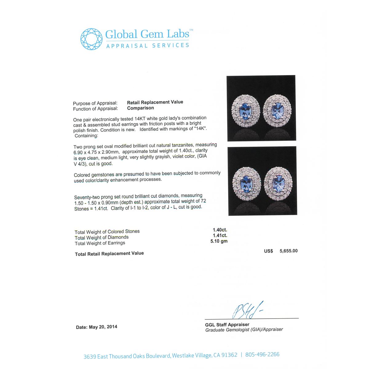 One pair electronically tested 14KT white gold Ladies combination cast & assembled stud earrings with friction posts with a bright polish finish. Condition is new. Identified with markings of "14K". Containing: Two prong set oval modified brilliant cut natural tanzanites, measuring 6.90 x 4.75 x 2.90mm, approximate. Total Weight of 1.40ct., clarity is eye clean, medium light, very slightly grayish, violet color, (GIA V 4/3), cut is good. Colored gemstones are presumed to have been subjected to commonly used color/clarity enhancement processes. Seventy-Two prong set round brilliant cut diamonds, measuring 1.50 - 1.50 x 0.90mm (depth est.) approximate. Total Weight of 72 Stones = 1.41ct. Clarity: I-1 to I-2. Color: J - L, Cut is Good. Total Weight of Colored Stones 1.40ct. Total Weight of Diamonds 1.41ct. Total Weight of Earrings 5.10 grams. GGL Appraised at $5,655.00.