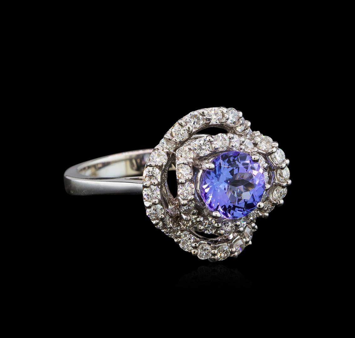 One electronically tested 14KT white gold ladies cast tanzanite and diamond ring with a bright polish finish. Identified with markings of "14K". Condition is new. Containing: One prong set round modified brilliant cut natural tanzanite, measuring 6.80 - 6.80 x 4.42 mm, approximate weight of 1.40 ct., clarity is eye clean, type I, medium light, very slightly grayish, violet color, (GIA V 4/3), cut is good. Forty prong set round brilliant cut diamonds, measuring 1.60 - 1.60 x 0.96mm (depth est.) approximate total weight of 40 Stones = 0.82ct. Clarity: SI-1 to SI-2. Color: H - I, Cut is Good. Colored gemstones are presumed to have been subjected to commonly used enhancement processes. All diamonds and colored gemstones are graded in the mounting, unless otherwise stated. Total Weight of Colored Stones 1.40 ct. Total Weight of Diamonds 0.82ct. Total Weight of Ring 5.40 grams. GGL Appraised.