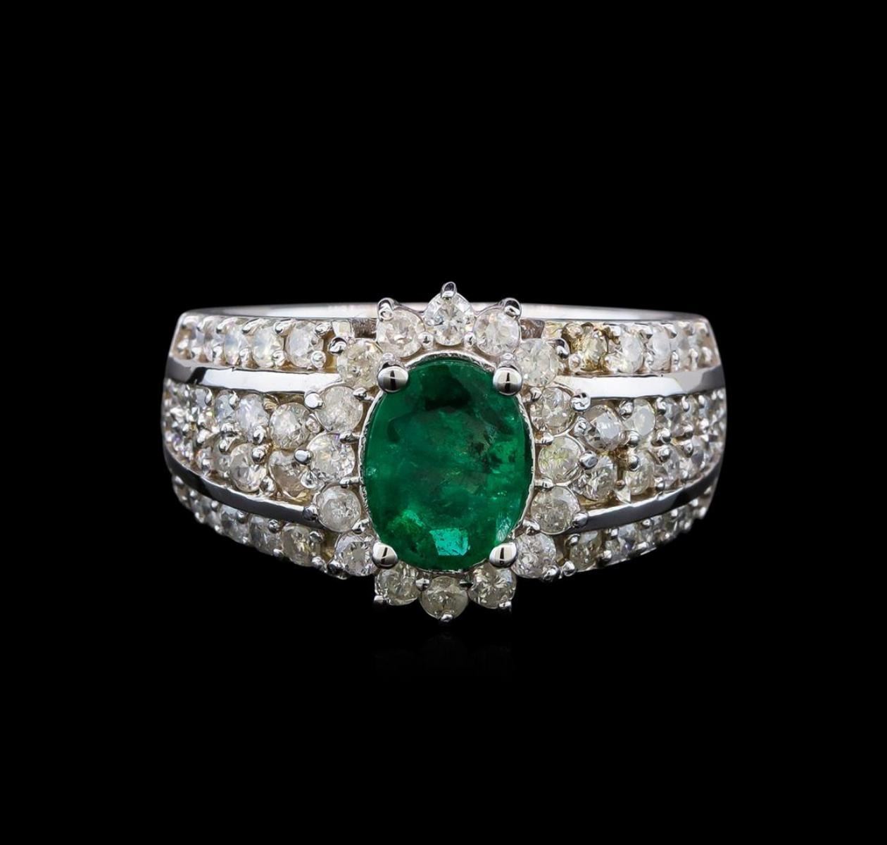 One electronically tested 14KT white gold ladies cast emerald and diamond ring with a bright polish finish. Identified with markings of "14K". Condition is very good. Containing: One prong set oval modified brilliant cut natural emerald, measuring 8.20 x 6.80 x 4.42mm, approximate total weight of 1.41ct., clarity is heavily included, type III, medium, moderately strong, green color, (GIA G 5/4)Sixty prong set round brilliant cut diamonds, measuring 1.90 - 1.30 x 0.96mm (depth est.) approximate total weight of 60 Stones = 0.89ct. Clarity: I-1 to I-2. Color: I - J. Colored gemstones are presumed to have been subjected to commonly used enhancement processes. All diamonds and colored gemstones are graded in the mounting, unless otherwise stated. Total Weight of Colored Stones 1.41ct. Total Weight of Diamonds 0.89ct. Total Weight of Ring 9.20 grams. GGL Appraised.