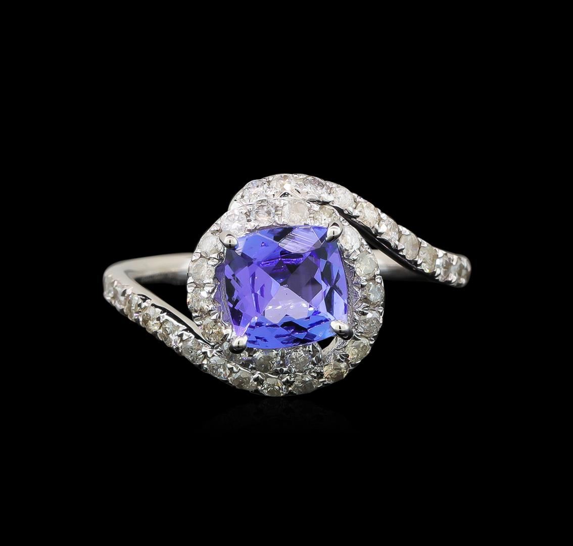 One electronically tested 14KT white gold ladies cast tanzanite and diamond ring with a bright polish finish. Identified with markings of "14K". Condition is new. Containing: One prong set square cushion modified brilliant cut natural tanzanite, measuring 6.50 x 6.50 x 4.23mm, approximate weight of 1.41ct., clarity is eye clean, type I, medium light, very slightly grayish, violet color, (GIA V 4/3), cut is good. Forty prong set round brilliant cut diamonds, measuring 1.30 - 1.30 x 0.78mm (depth est.) approximate total weight of 40 Stones = 0.70ct. Clarity: I-1 to I-2. Color: I - J. All diamonds and colored gemstones are graded in the mounting, unless otherwise stated. Colored gemstones are presumed to have been subjected to commonly used enhancement processes. Total Weight of Colored Stones 1.41ct. Total Weight of Diamonds 0.70ct. Total Weight of Ring 3.20 grams. GGL Appraised.