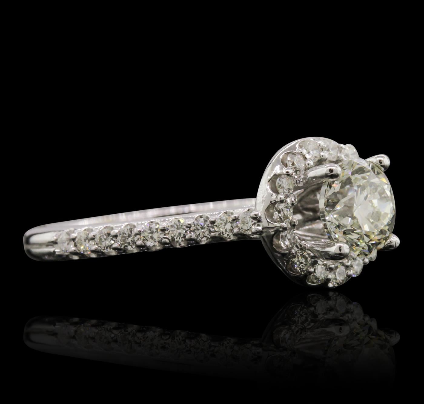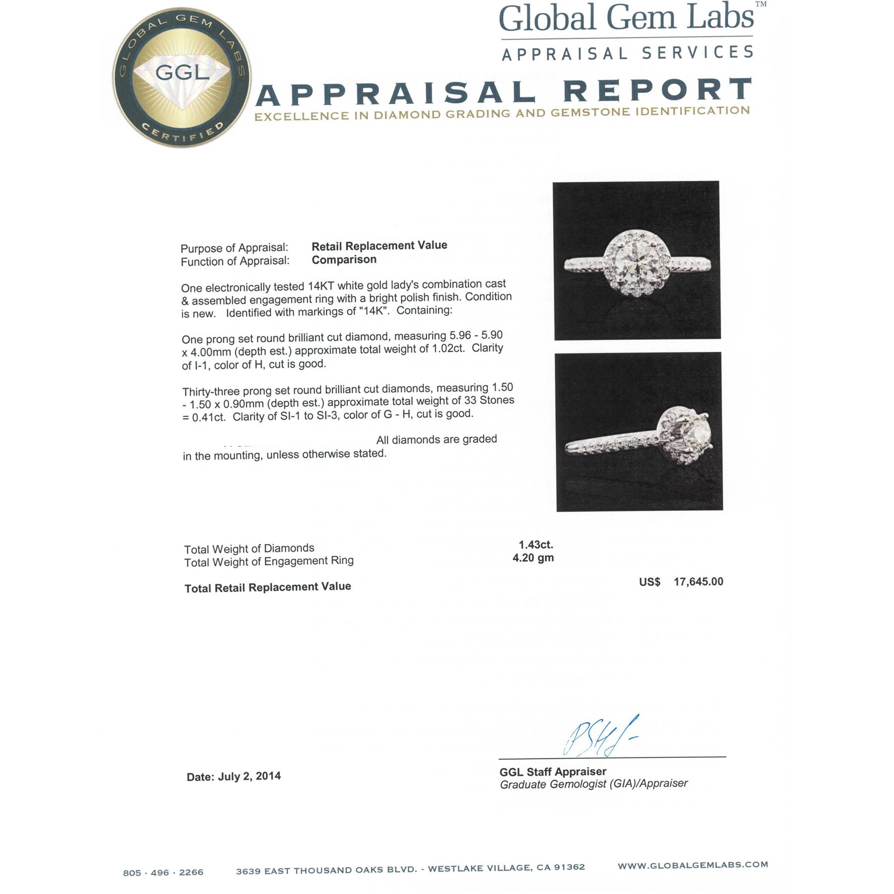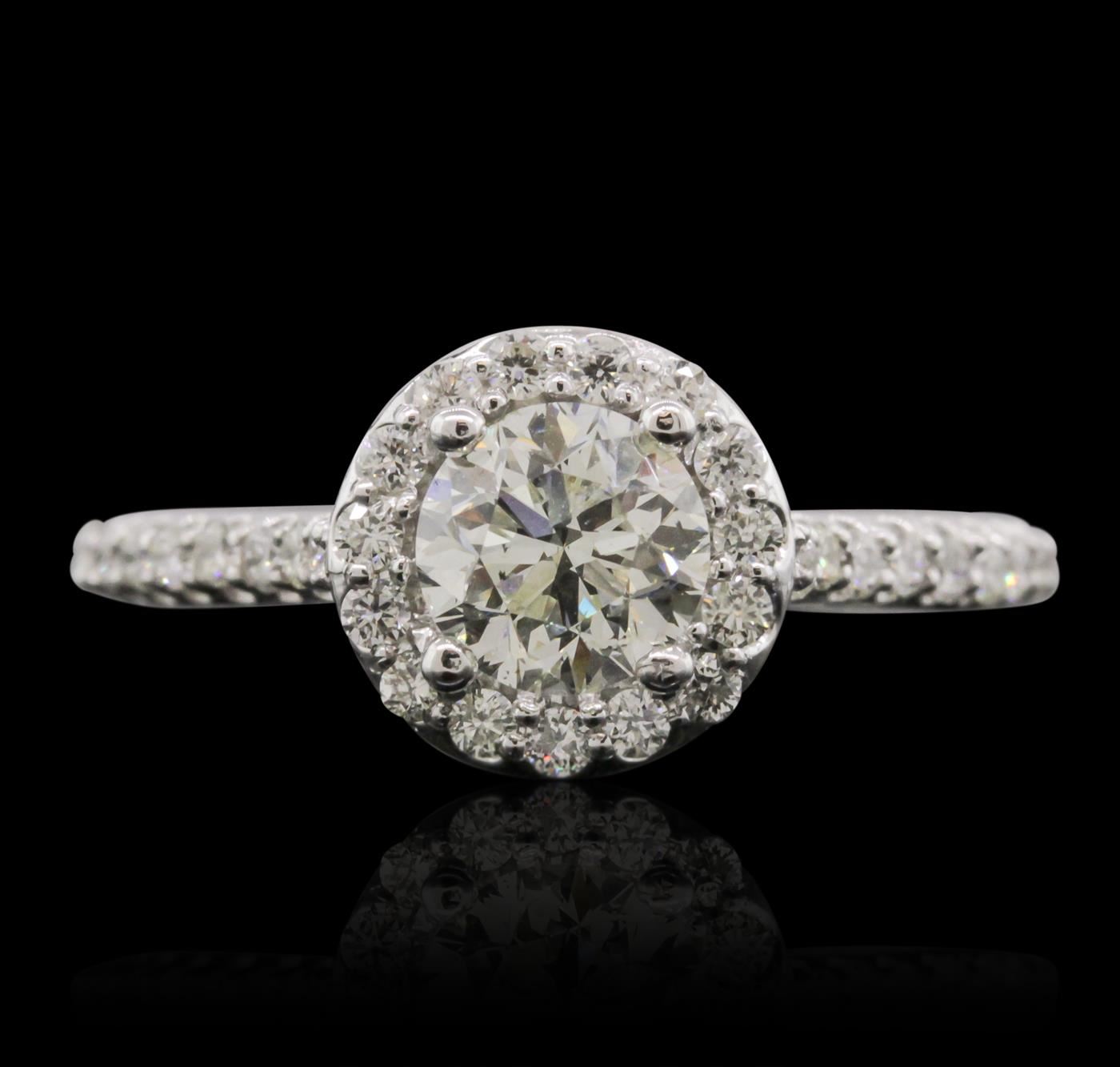 One electronically tested 14KT white gold Ladies combination cast & assembled engagement ring with a bright polish finish. Condition is new. Identified with markings of "14K". Containing: One prong set round brilliant cut diamond, measuring 5.96 - 5.90 x 4.00mm (depth est.) approximate. Total Weight of 1.02ct. Clarity: I-1. Color: H, Cut is Good. Thirty-Three prong set round brilliant cut diamonds, measuring 1.50 - 1.50 x 0.90mm (depth est.) approximate. Total Weight of 33 Stones = 0.41ct. Clarity: SI-1 to SI-3. Color: G - H, Cut is Good. EGL USA GEM ID# US 911348440D. All diamonds are graded in the mounting, unless otherwise stated. Total Weight of Diamonds 1.43ct. Total Weight of Engagement Ring 4.20 grams. GGL Appraised at $17,645.00.