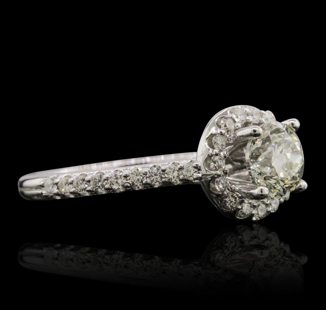 One electronically tested 14KT white gold Ladies combination cast & assembled engagement ring with a bright polish finish. Condition is new. Identified with markings of "14K". Containing: One prong set round brilliant cut diamond, measuring 5.96 - 5.90 x 4.00mm (depth est.) approximate. Total Weight of 1.02ct. Clarity: I-1. Color: H, Cut is Good. Thirty-Three prong set round brilliant cut diamonds, measuring 1.50 - 1.50 x 0.90mm (depth est.) approximate. Total Weight of 33 Stones = 0.41ct. Clarity: SI-1 to SI-3. Color: G - H, Cut is Good. EGL USA GEM ID# US 911348440D. All diamonds are graded in the mounting, unless otherwise stated. Total Weight of Diamonds 1.43ct. Total Weight of Engagement Ring 4.20 grams. GGL Appraised.