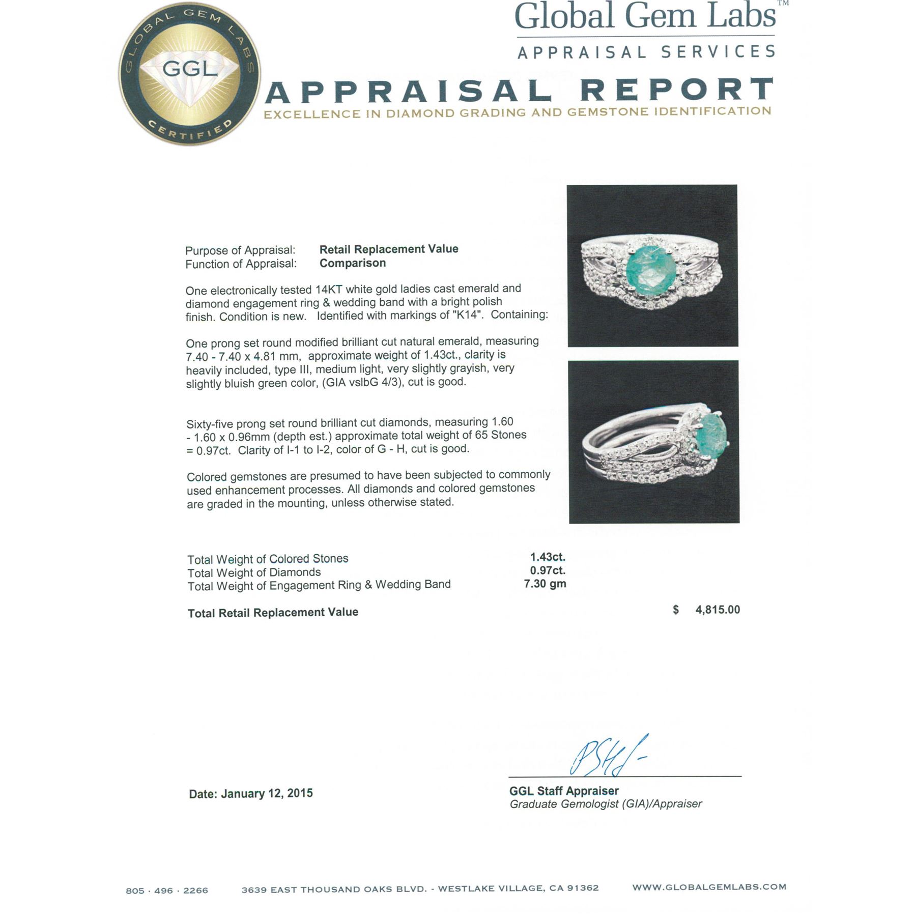 One electronically tested 14KT white gold ladies cast emerald and diamond engagement ring & wedding band with a bright polish finish. Identified with markings of "K14". Condition is new. Containing: One prong set round modified brilliant cut natural emerald, measuring 7.40 - 7.40 x 4.81 mm, approximate weight of 1.43ct., clarity is heavily included, type III, medium light, very slightly grayish, very slightly bluish green color, (GIA vslbG 4/3), cut is good. Sixty-Five prong set round brilliant cut diamonds, measuring 1.60 - 1.60 x 0.96mm (depth est.) approximate total weight of 65 Stones = 0.97ct. Clarity: I-1 to I-2. Color: G - H, Cut is Good. Colored gemstones are presumed to have been subjected to commonly used enhancement processes. All diamonds and colored gemstones are graded in the mounting, unless otherwise stated. Total Weight of Colored Stones 1.43ct. Total Weight of Diamonds 0.97ct. Total Weight of Engagement Ring & Wedding Band 7.30 grams. GGL Appraised at $4,815.00.