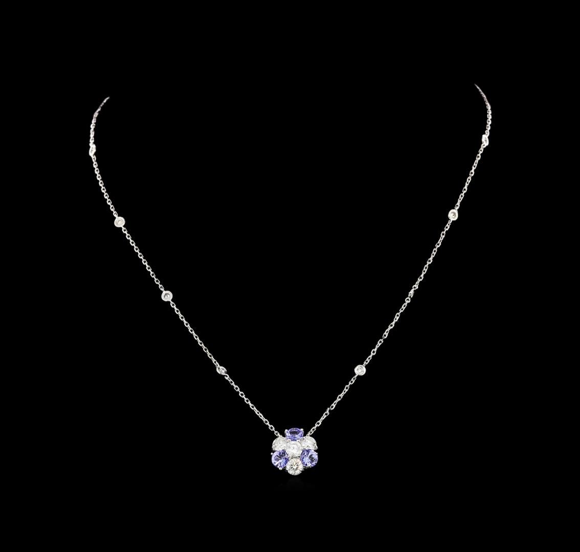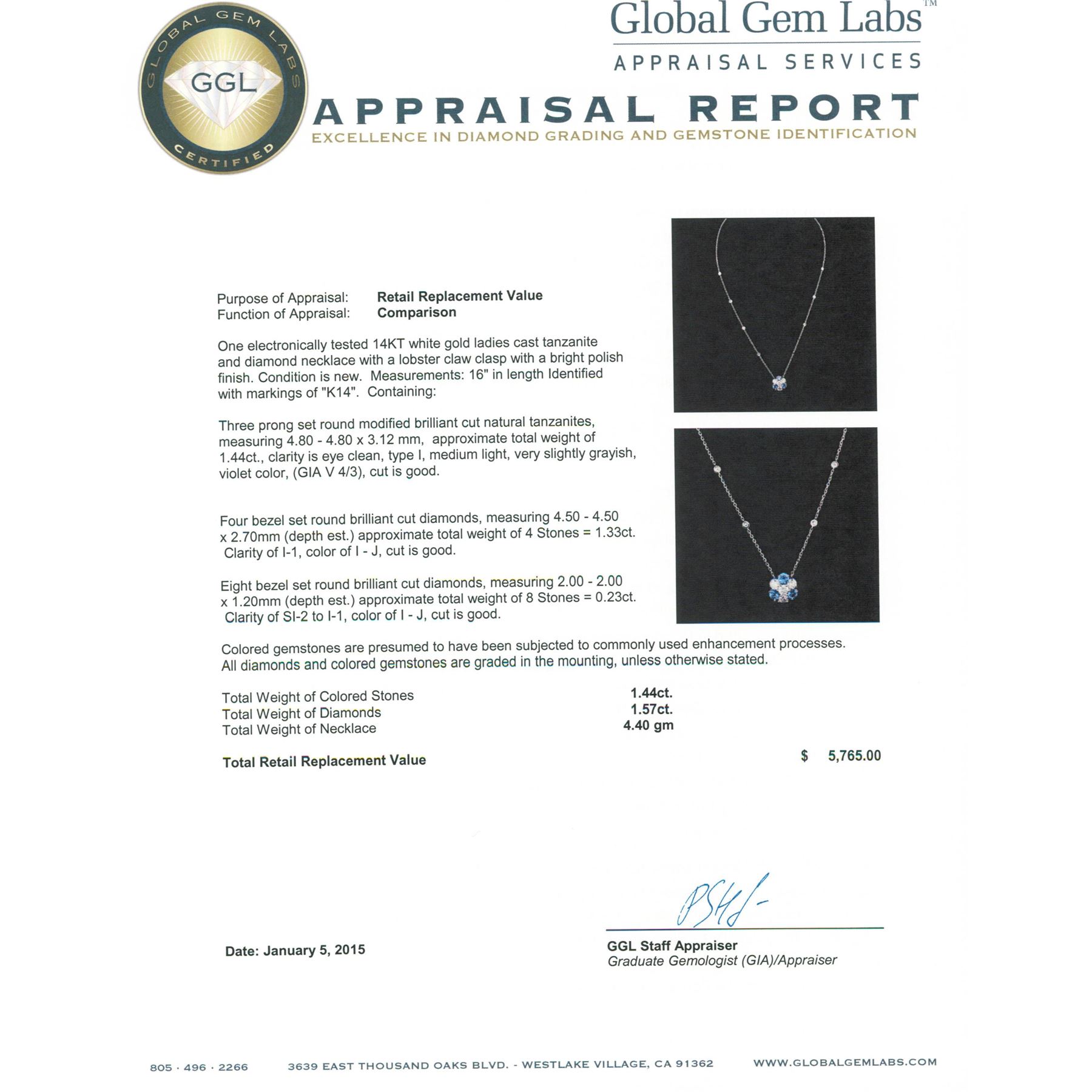 One electronically tested 14KT white gold ladies cast tanzanite and diamond necklace with a lobster claw clasp with a bright polish finish. Measurements: 16" in length Identified with markings of "K14". Condition is new. Containing: Three prong set round modified brilliant cut natural tanzanites, measuring 4.80 - 4.80 x 3.12 mm, approximate total weight of 1.44ct., clarity is eye clean, type I, medium light, very slightly grayish, violet color, (GIA V 4/3), cut is good. Four bezel set round brilliant cut diamonds, measuring 4.50 - 4.50 x 2.70mm (depth est.) approximate total weight of 4 Stones = 1.33ct. Clarity: I-1. Color: I - J, Cut is Good. Eight bezel set round brilliant cut diamonds, measuring 2.00 - 2.00 x 1.20mm (depth est.) approximate total weight of 8 Stones = 0.23ct. Clarity: SI-2 to I-1. Color: I - J, Cut is Good. Colored gemstones are presumed to have been subjected to commonly used enhancement processes. All diamonds and colored gemstones are graded in the mounting, unless otherwise stated. Total Weight of Colored Stones 1.44ct. Total Weight of Diamonds 1.57ct. Total Weight of Necklace 4.40 grams. GGL Appraised.