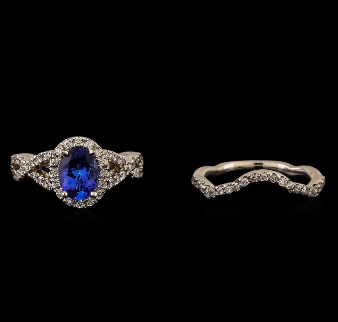 One electronically tested 14KT white gold ladies cast tanzanite and diamond ring and guard with a bright polish finish. Identified with markings of "14K". Condition is new. Containing: One prong set oval modified brilliant cut natural tanzanite, measuring 8.20 x 6.20 x 4.03mm, approximate weight of 1.44ct., clarity is eye clean, type I, medium light, very slightly grayish, violet color, (GIA V 4/3), cut is good. Seventy-Five prong set round brilliant cut diamonds, measuring 1.30 - 1.30 x 0.78mm (depth est.) approximate total weight of 75 Stones = 0.60ct. Clarity: I-1 to I-2. Color: I - J, Cut is Good. Colored gemstones are presumed to have been subjected to commonly used enhancement processes. All diamonds and colored gemstones are graded in the mounting, unless otherwise stated. Total Weight of Colored Stones 1.44ct. Total Weight of Diamonds 0.60ct. Total Weight of Ring And Guard 7.90 grams. GGL Appraised.