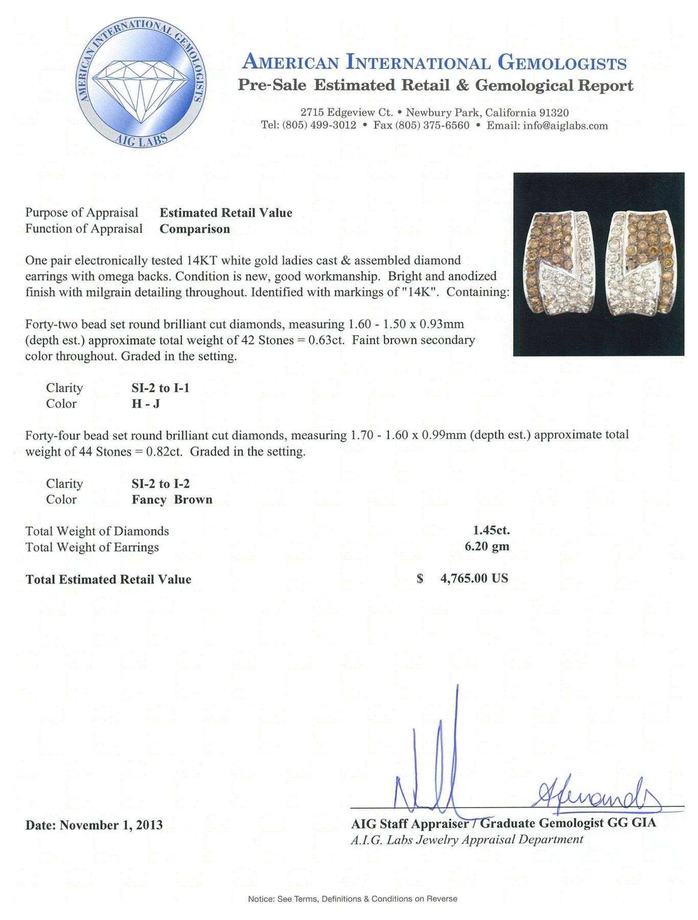 One pair electronically tested 14KT white gold ladies cast & assembled diamond earrings with omega backs. Condition is new, good workmanship. Bright and anodized finish with milgrain detailing throughout. Identified with markings of "14K". Containing: Forty-two bead set round brilliant cut diamonds, measuring 1.60 - 1.50 x 0.93mm (depth est.) approximate total weight of 42 Stones = 0.63ct. Faint brown secondary. Color throughout. Graded in the setting. Clarity SI-2 to I-1. Color H -- J. Forty-four bead set round brilliant cut diamonds, measuring 1.70 - 1.60 x 0.99mm (depth est.) approximate total weight of 44 Stones = 0.82ct. Graded in the setting. Clarity SI-2 to I-2. Color Fancy Brown. Total Weight of Diamonds 1.45ct. Total Weight of Earrings 6.20gm. AIG Appraised.
