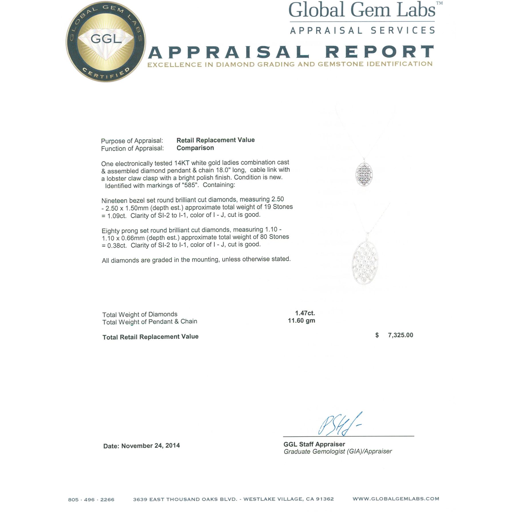 One electronically tested 14KT white gold ladies combination cast & assembled diamond pendant & chain 18.0" long, cable link with a lobster claw clasp with a bright polish finish. Identified with markings of "585". Condition is new. Containing: Nineteen bezel set round brilliant cut diamonds, measuring 2.50 - 2.50 x 1.50mm (depth est.) approximate total weight of 19 Stones = 1.09ct. Clarity: SI-2 to I-1. Color: I - J, Cut is Good. Eighty prong set round brilliant cut diamonds, measuring 1.10 - 1.10 x 0.66mm (depth est.) approximate total weight of 80 Stones = 0.38ct. Clarity: SI-2 to I-1. Color: I - J, Cut is Good. All diamonds are graded in the mounting, unless otherwise stated. Total Weight of Diamonds 1.47ct. Total Weight of Pendant & Chain 11.60 grams. GGL Appraised.
