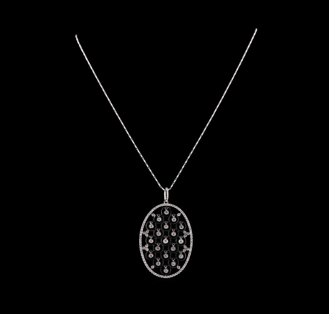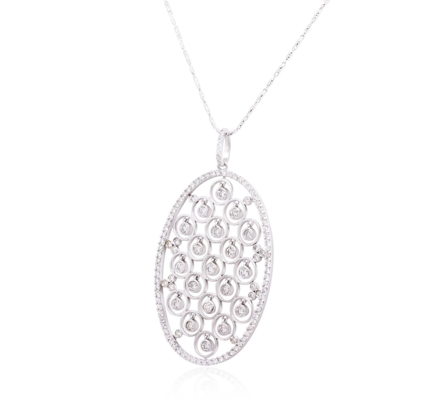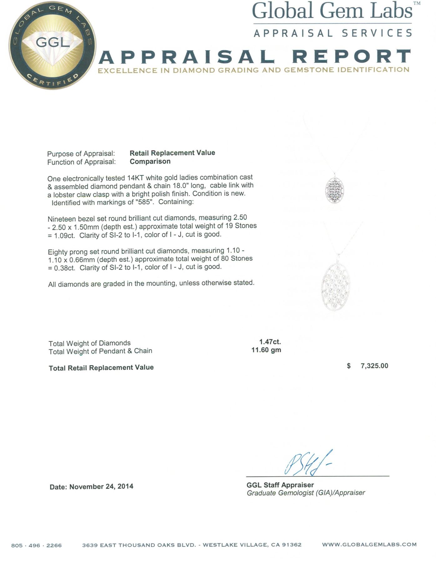 One electronically tested 14KT white gold ladies combination cast & assembled diamond pendant & chain 18.0" long, cable link with a lobster claw clasp with a bright polish finish. Identified with markings of "585". Condition is new. Containing: Nineteen bezel set round brilliant cut diamonds, measuring 2.50 - 2.50 x 1.50mm (depth est.) approximate total weight of 19 Stones = 1.09ct. Clarity: SI-2 to I-1. Color: I - J, Cut is Good. Eighty prong set round brilliant cut diamonds, measuring 1.10 - 1.10 x 0.66mm (depth est.) approximate total weight of 80 Stones = 0.38ct. Clarity: SI-2 to I-1. Color: I - J, Cut is Good. All diamonds are graded in the mounting, unless otherwise stated. Total Weight of Diamonds 1.47ct. Total Weight of Pendant & Chain 11.60 grams. GGL Appraised.