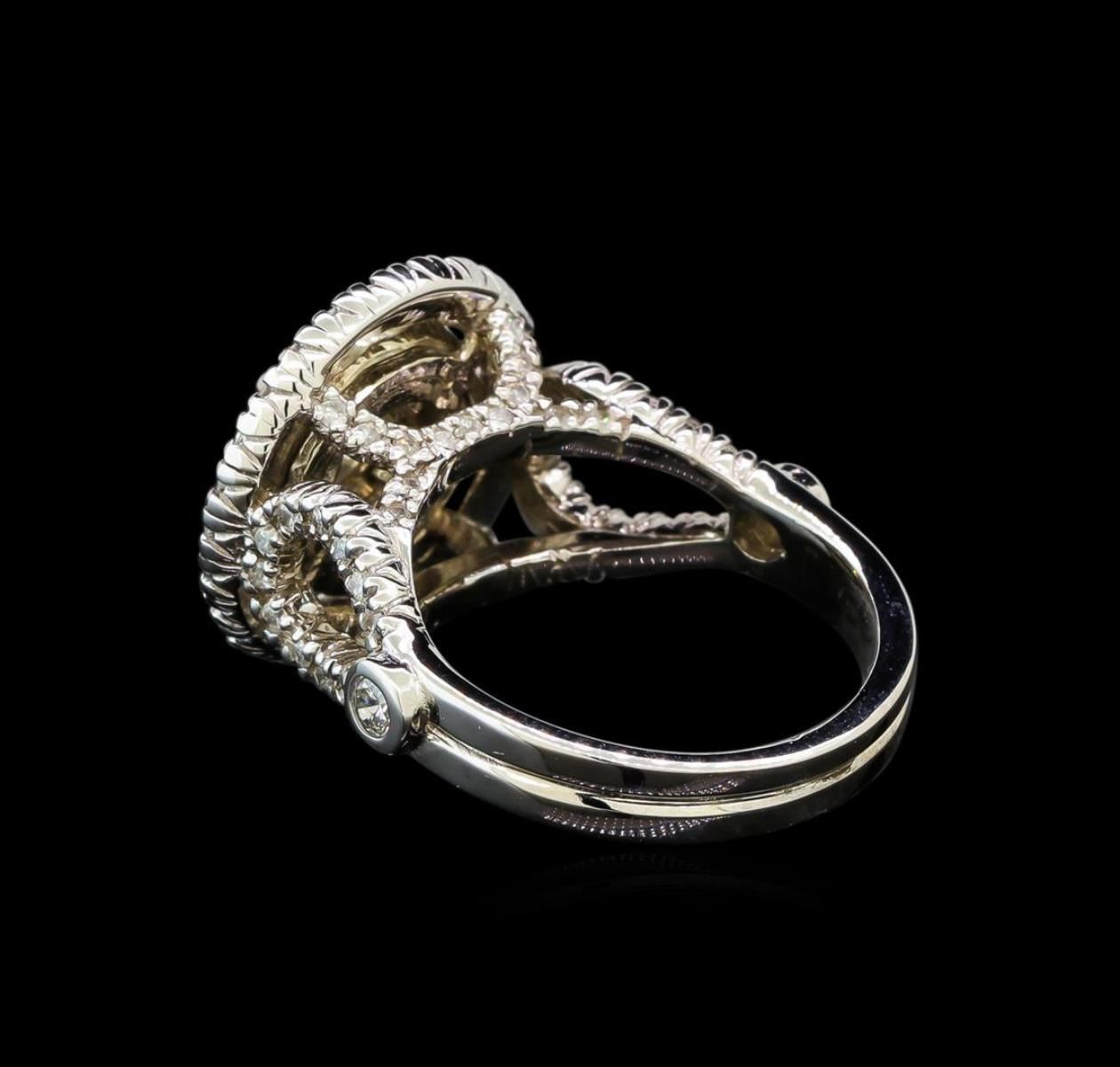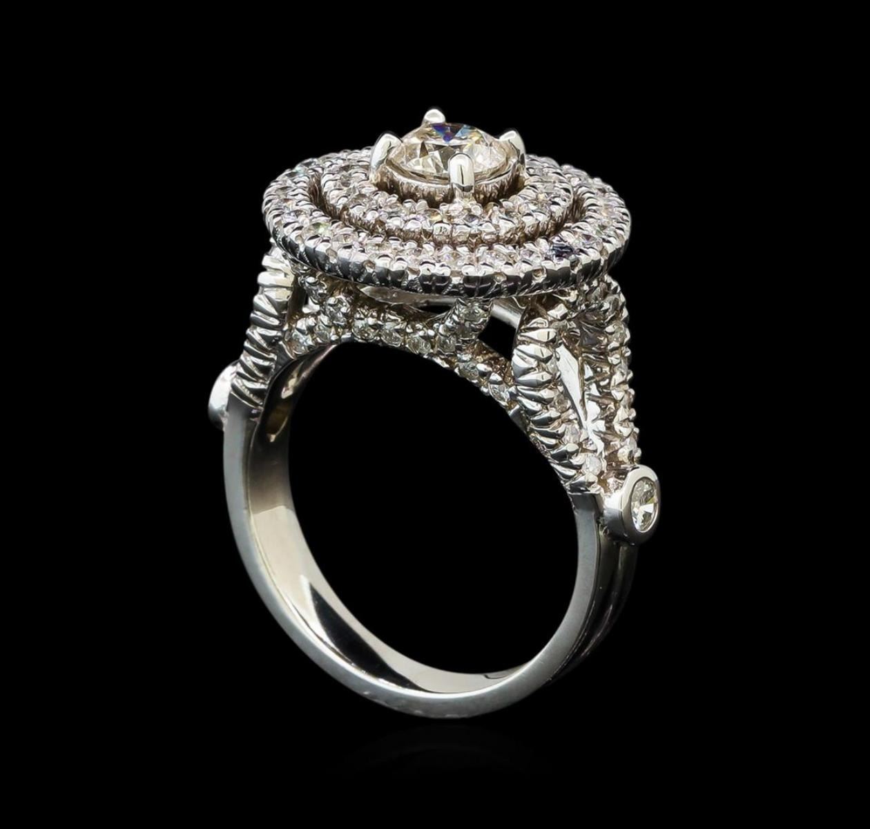One electronically tested 14KT white gold ladies cast diamond engagement ring with a bright polish finish. Identified with markings of "14K". Condition is new. Containing: One prong set round brilliant cut diamond, measuring 5.10 - 5.07 x 3.05mm (depth est.) approximate weight of 0.48ct. Clarity: I-2. Color: K, Cut is Good. Ninety-Four prong set round brilliant cut diamonds, measuring 2.00 - 1.10 x 0.93mm (depth est.) approximate total weight of 94 Stones = 1.00ct. Clarity: SI-1 to I-1. Color: I - J. All diamonds are graded in the mounting, unless otherwise stated. Total Weight of Diamonds 1.48ct. Total Weight of Engagement Ring 8.50 grams. GGL Appraised at $6,280.00.