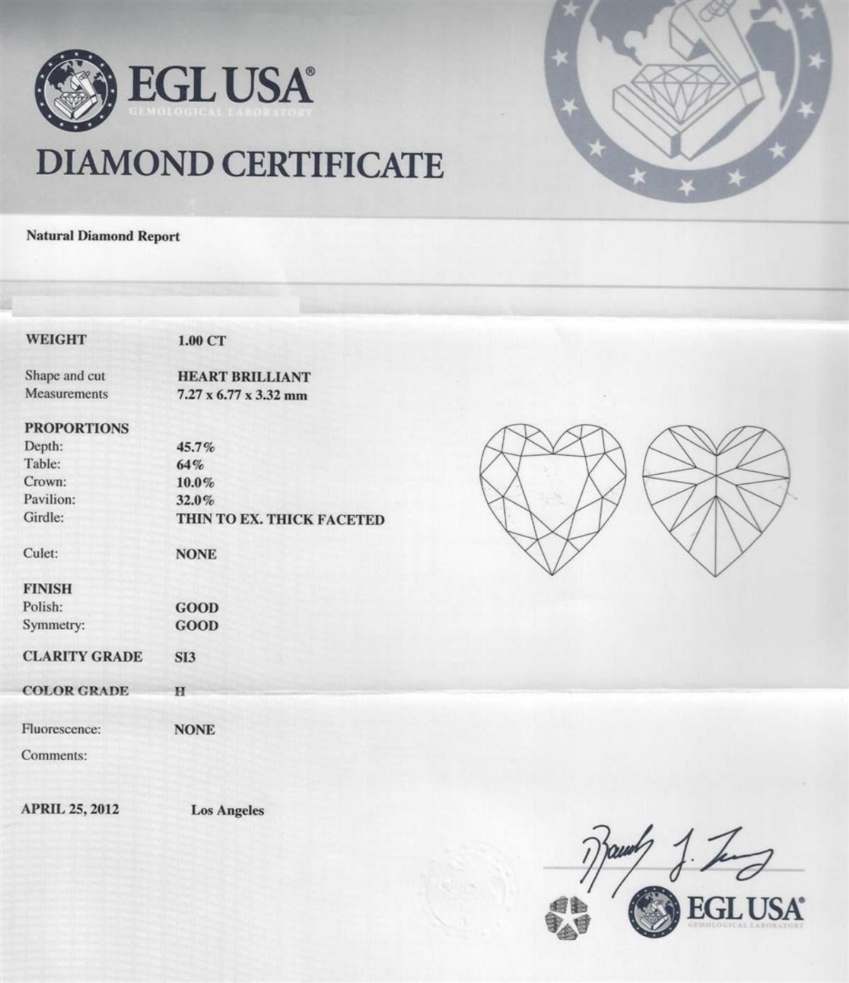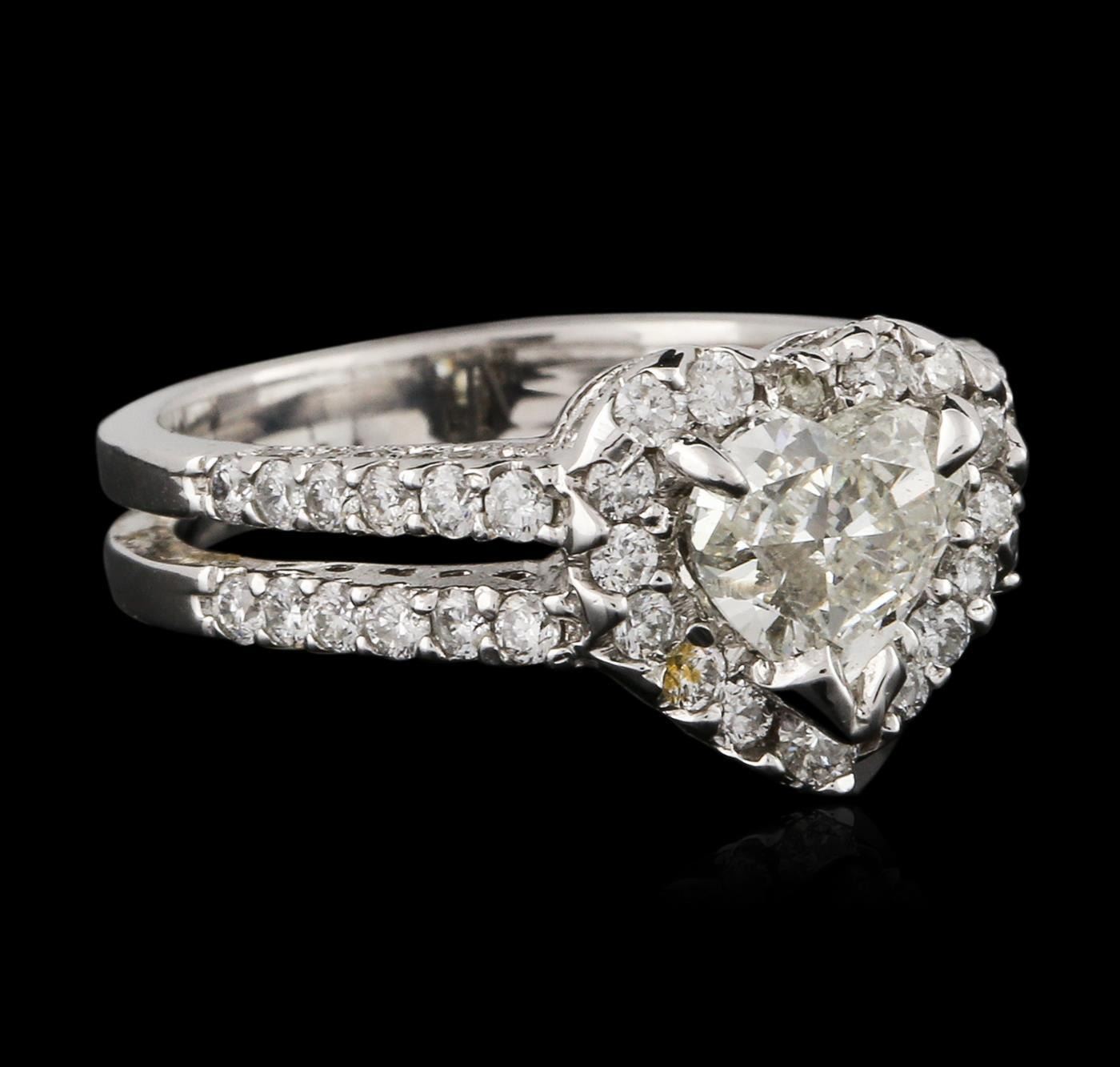 One ring featuring: 14KT white gold weighing 5.72 grams containing diamonds with a total weight of 1.49ct. Center Diamond: Weight: 1.00ct. Shape and cut: Heart Brilliant. Measurements: 7.27 x 6.77 x 3.32mm. Depth: 45.7%. Table: 64%. Crown: 10.0%. Pavilion: 32.0%. Girdle: Thin To Ex. Thick Faceted. Culet: None. Polish: Good. Symmetry: Good. Clarity Grade: SI3. Color Grade: H. Fluorescence: None. UGS Appraised.