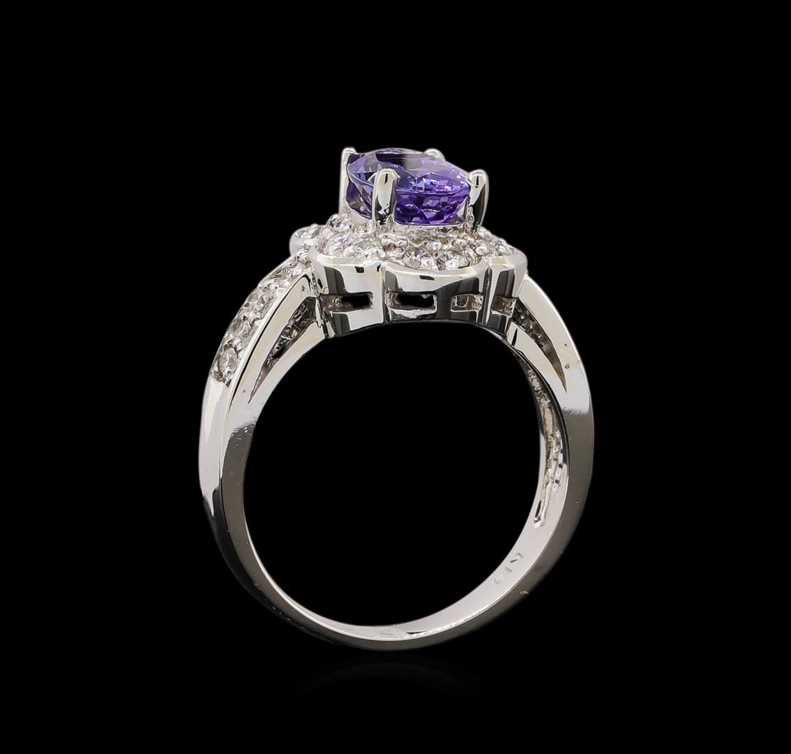One electronically tested 14KT white gold ladies cast tanzanite and diamond ring with a bright polish finish. Identified with markings of "14K". Condition is new. Containing: One prong set oval modified brilliant cut natural tanzanite, measuring 8.50 x 6.20 x 4.03mm, approximate weight of 1.49ct., clarity is eye clean, type I, medium light, very slightly grayish, violet color, (GIA V 4/3), cut is good. Twenty-Six prong set round brilliant cut diamonds, measuring 1.50 - 1.50 x 0.90mm (depth est.) approximate total weight of 26 Stones = 0.32ct. Clarity: SI-1 to SI-2. Color: I - J, Cut is Good. Colored gemstones are presumed to have been subjected to commonly used enhancement processes. All diamonds and colored gemstones are graded in the mounting, unless otherwise stated. Total Weight of Colored Stones 1.49ct. Total Weight of Diamonds 0.32ct. Total Weight of Ring 6.00 grams. GGL Appraised.