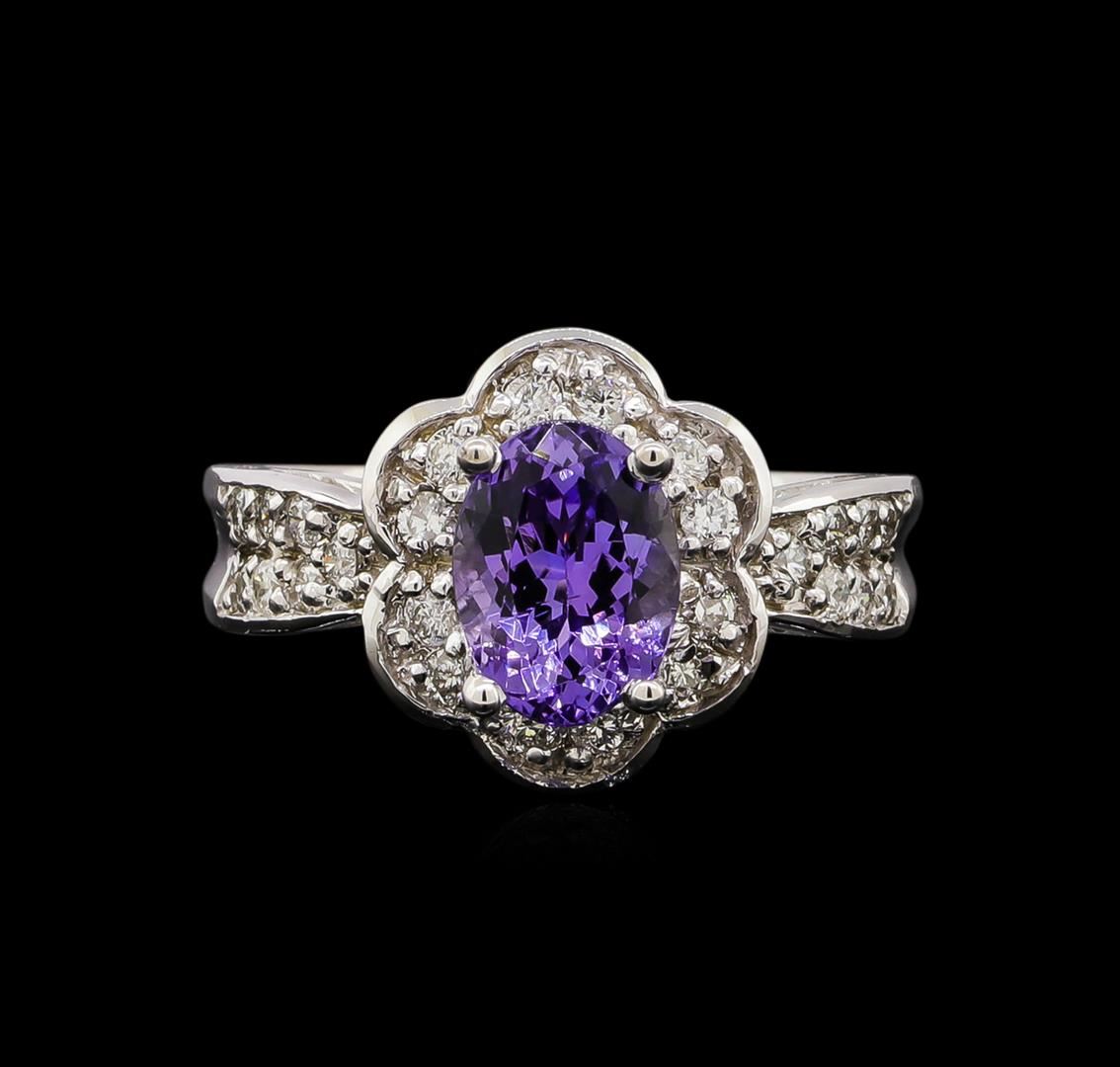 One electronically tested 14KT white gold ladies cast tanzanite and diamond ring with a bright polish finish. Identified with markings of "14K". Condition is new. Containing: One prong set oval modified brilliant cut natural tanzanite, measuring 8.50 x 6.20 x 4.03mm, approximate weight of 1.49ct., clarity is eye clean, type I, medium light, very slightly grayish, violet color, (GIA V 4/3), cut is good. Twenty-Six prong set round brilliant cut diamonds, measuring 1.50 - 1.50 x 0.90mm (depth est.) approximate total weight of 26 Stones = 0.32ct. Clarity: SI-1 to SI-2. Color: I - J, Cut is Good. Colored gemstones are presumed to have been subjected to commonly used enhancement processes. All diamonds and colored gemstones are graded in the mounting, unless otherwise stated. Total Weight of Colored Stones 1.49ct. Total Weight of Diamonds 0.32ct. Total Weight of Ring 6.00 grams. GGL Appraised.
