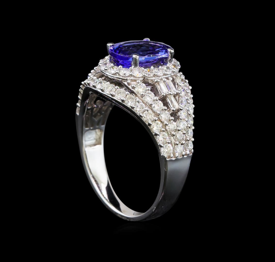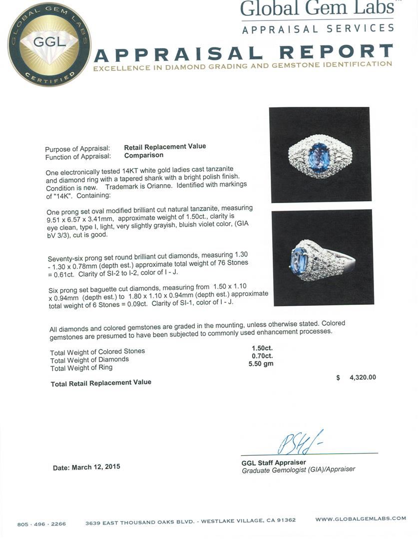 One electronically tested 14KT white gold ladies cast tanzanite and diamond ring with a tapered shank with a bright polish finish. Trademark is Orianne. Identified with markings of "14K". Condition is new. Containing: One prong set oval modified brilliant cut natural tanzanite, measuring 9.51 x 6.57 x 3.41mm, approximate weight of 1.50 ct., clarity is eye clean, type I, light, very slightly grayish, bluish violet color, (GIA bV 3/3), cut is good. Seventy-Six prong set round brilliant cut diamonds, measuring 1.30 - 1.30 x 0.78mm (depth est.) approximate total weight of 76 Stones = 0.61ct. Clarity: SI-2 to I-2. Color: I - J. Six prong set baguette cut diamonds, measuring from 1.50 x 1.10 x 0.94mm (depth est.) to 1.80 x 1.10 x 0.94mm (depth est.) approximate total weight of 6 Stones = 0.09ct. Clarity: SI-1. Color: I - J. All diamonds and colored gemstones are graded in the mounting, unless otherwise stated. Colored gemstones are presumed to have been subjected to commonly used enhancement processes. Total Weight of Colored Stones 1.50 ct. Total Weight of Diamonds 0.70 ct. Total Weight of Ring 5.50 grams. GGL Appraised.