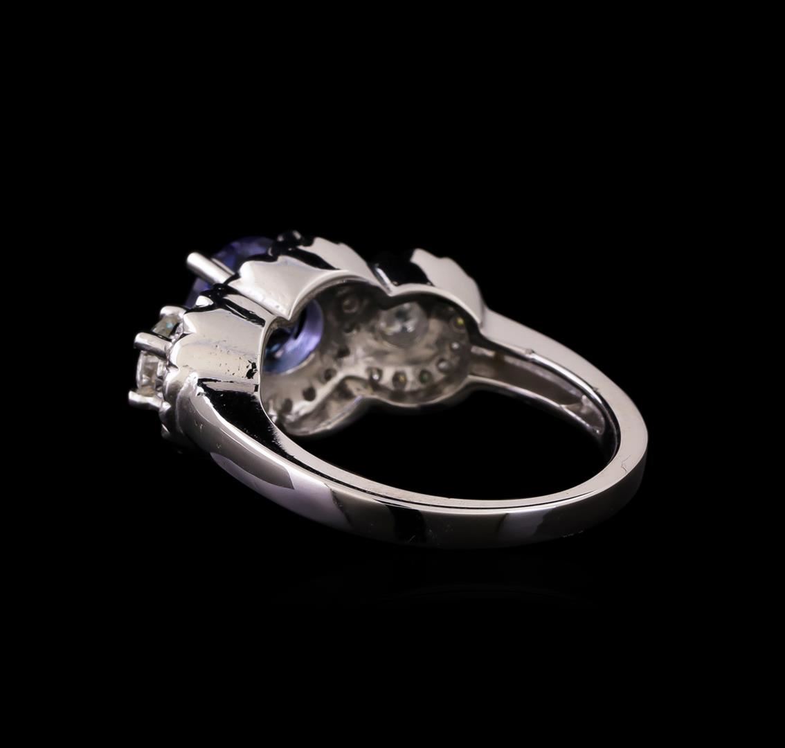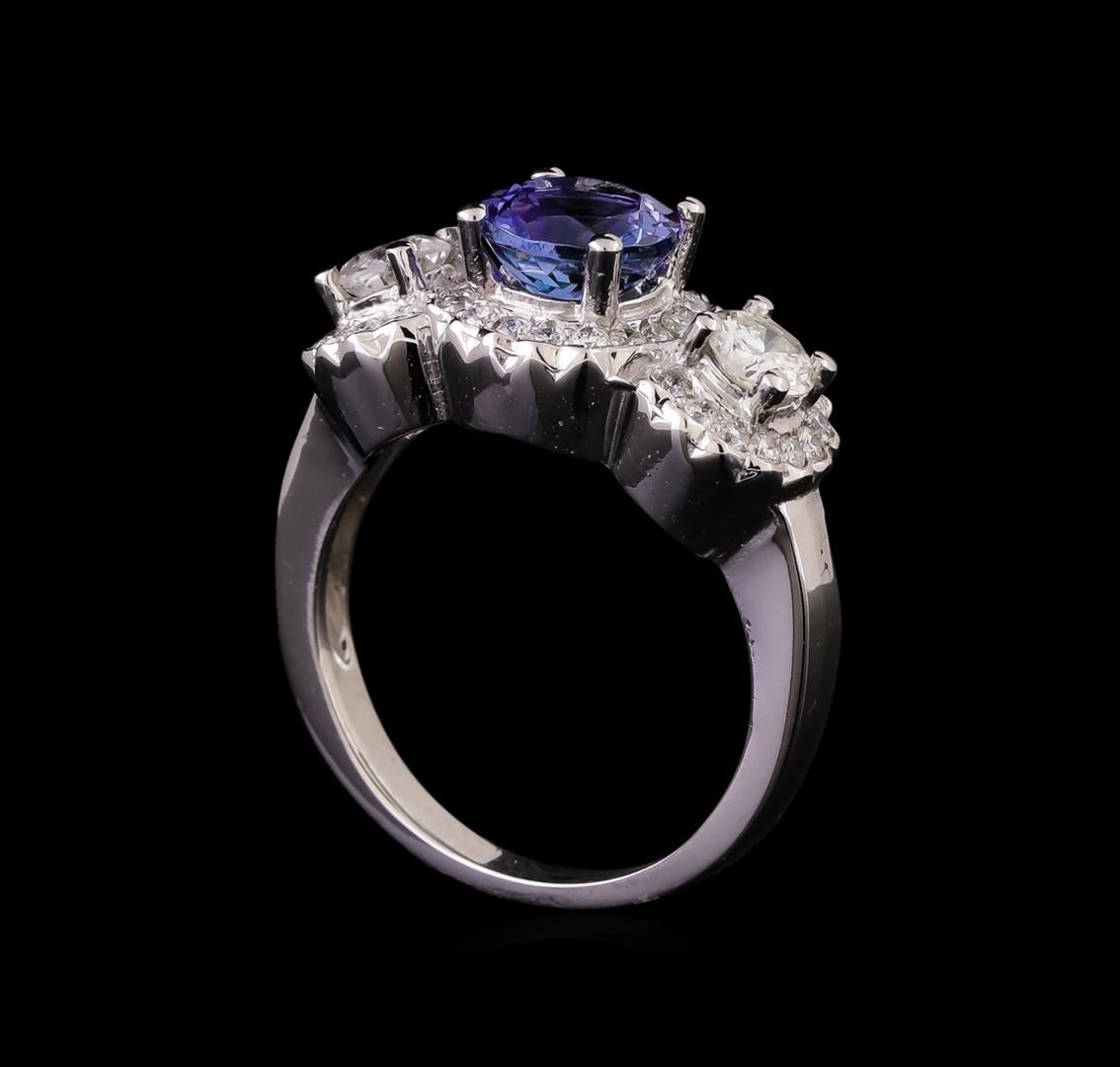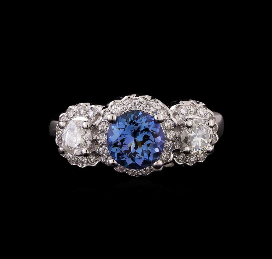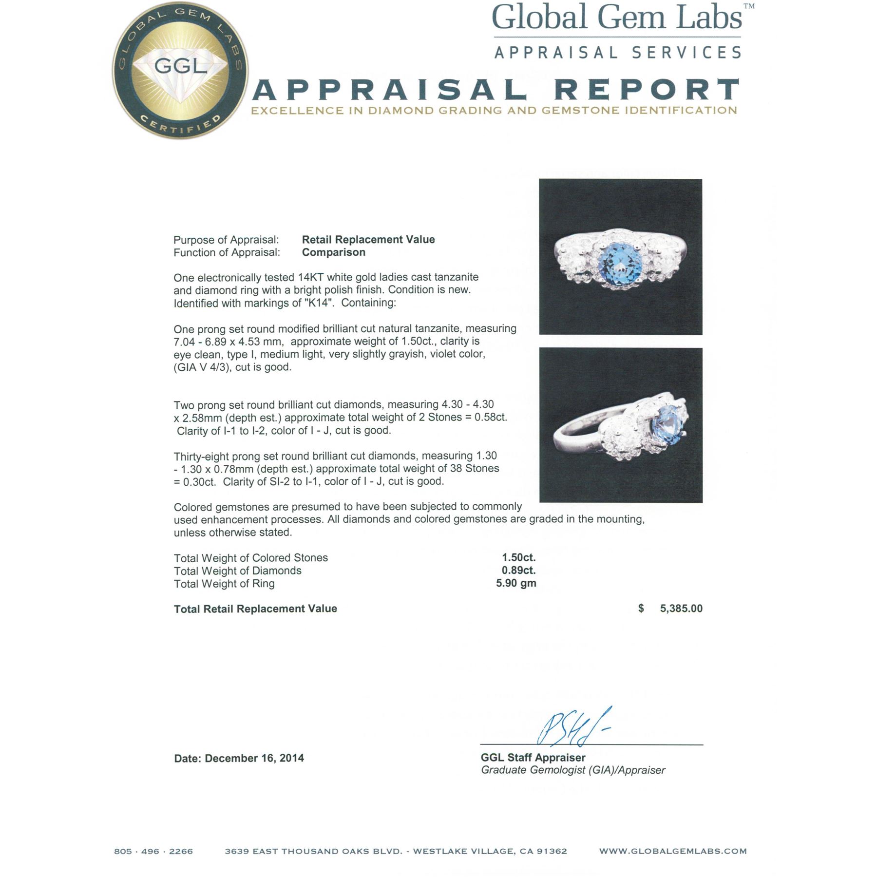 One electronically tested 14KT white gold ladies cast tanzanite and diamond ring with a bright polish finish. Identified with markings of "K14". Condition is new. Containing: One prong set round modified brilliant cut natural tanzanite, measuring 7.04 - 6.89 x 4.53 mm, approximate weight of 1.50ct., clarity is eye clean, type I, medium light, very slightly grayish, violet color, (GIA V 4/3), cut is good. Two prong set round brilliant cut diamonds, measuring 4.30 - 4.30 x 2.58mm (depth est.) approximate total weight of 2 Stones = 0.58ct. Clarity: I-1 to I-2. Color: I - J, Cut is Good. Thirty-Eight prong set round brilliant cut diamonds, measuring 1.30 - 1.30 x 0.78mm (depth est.) approximate total weight of 38 Stones = 0.30ct. Clarity: SI-2 to I-1. Color: I - J, Cut is Good. Colored gemstones are presumed to have been subjected to commonly used enhancement processes. All diamonds and colored gemstones are graded in the mounting, unless otherwise stated. Total Weight of Colored Stones 1.50ct. Total Weight of Diamonds 0.89ct. Total Weight of Ring 5.90 grams. GGL Appraised.
