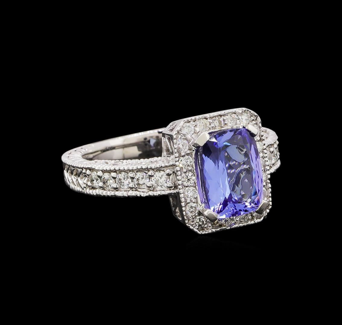 One electronically tested 14KT white gold ladies combination cast & assembled tanzanite and diamond ring with a bright polish finish. Identified with markings of "14K". Condition is new. Containing: One prong set rectangular cushion modified brilliant cut natural tanzanite, measuring 8.80 x 6.80 x 3.26mm, approximate weight of 1.54ct., clarity is eye clean, type I, medium light, slightly grayish, violet color, (GIA V 4/2), cut is good. Thirty prong set round brilliant cut diamonds, measuring 1.60 - 1.30 x 0.87mm (depth est.) approximate total weight of 30 Stones = 0.33ct. Clarity: SI-1 to SI-2. Color: I - J, Cut is Good. Colored gemstones are presumed to have been subjected to commonly used enhancement processes. All diamonds and colored gemstones are graded in the mounting, unless otherwise stated. Total Weight of Colored Stones 1.54ct. Total Weight of Diamonds 0.33ct. Total Weight of Ring 6.50 grams. GGL Appraised.