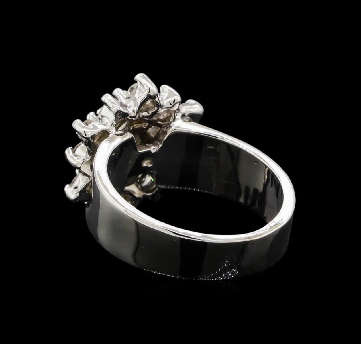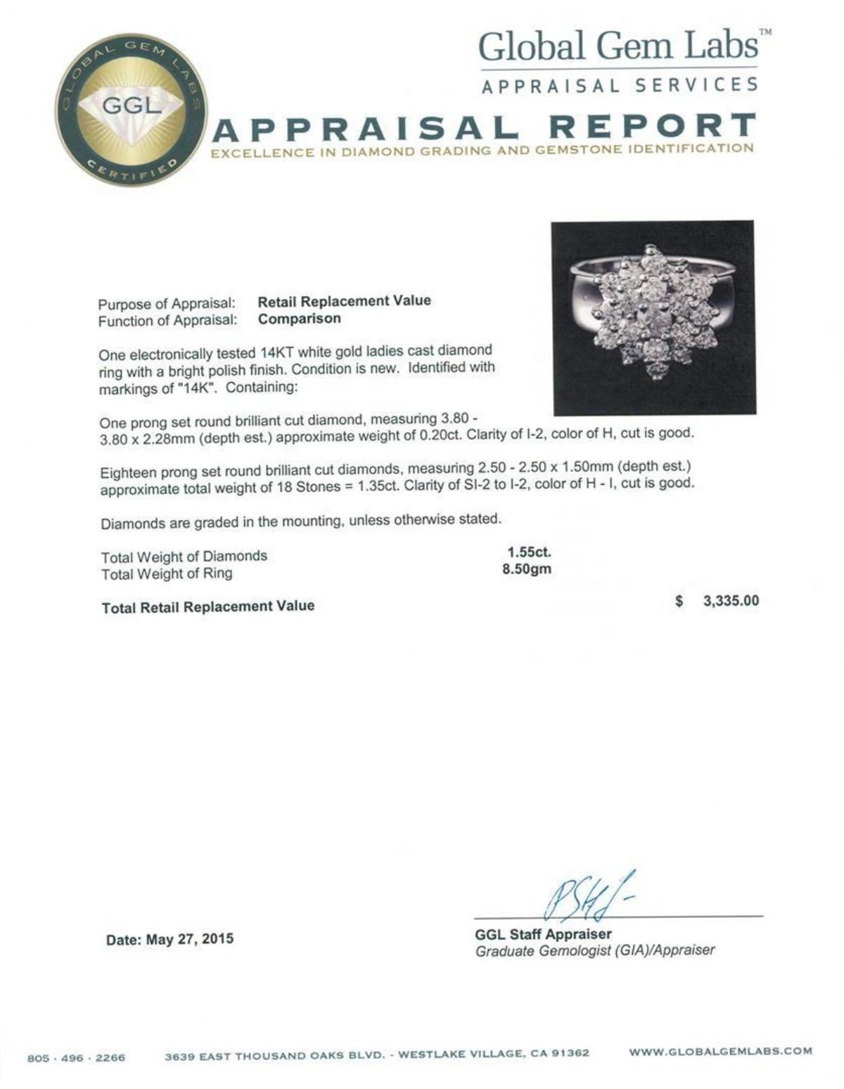 One electronically tested 14KT white gold ladies cast diamond ring with a bright polish finish. Identified with markings of "14K". Condition is new. Containing: One prong set round brilliant cut diamond, measuring 3.80 - 3.80 x 2.28mm (depth est.) approximate weight of 0.20ct. Clarity: I-2. Color: H, Cut is Good. Eighteen prong set round brilliant cut diamonds, measuring 2.50 - 2.50 x 1.50mm (depth est.) approximate total weight of 18 Stones = 1.35ct. Clarity: SI-2 to I-2. Color: H - I, Cut is Good. Diamonds are graded in the mounting, unless otherwise stated. Total Weight of Diamonds 1.55ct. Total Weight of Ring 8.50 grams. GGL Appraised.