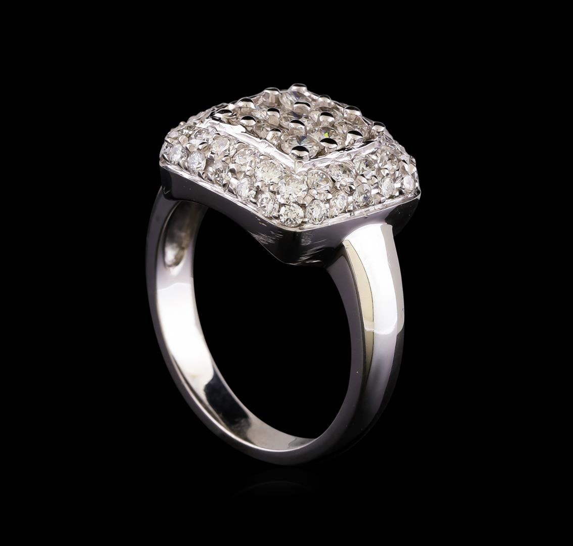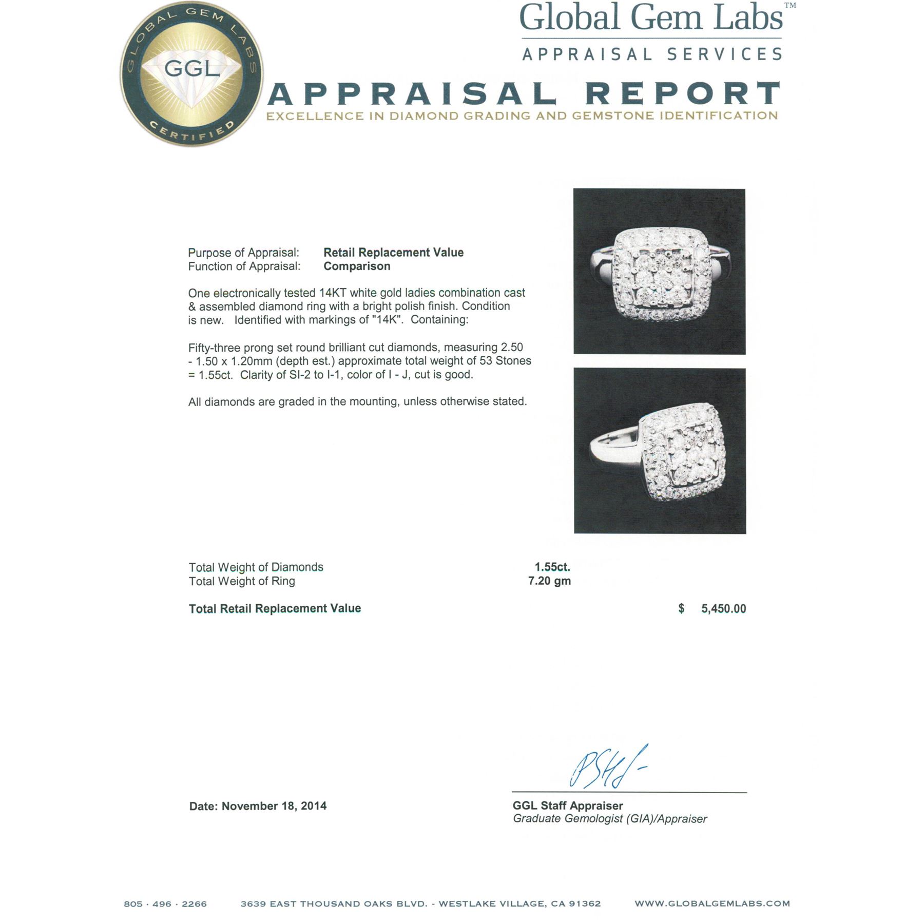 One electronically tested 14KT white gold ladies combination cast & assembled diamond ring with a bright polish finish. Identified with markings of "14K". Condition is new. Containing: Fifty-Three prong set round brilliant cut diamonds, measuring 2.50 - 1.50 x 1.20mm (depth est.) approximate total weight of 53 Stones = 1.55ct. Clarity: SI-2 to I-1. Color: I - J, Cut is Good. All diamonds are graded in the mounting, unless otherwise stated. Total Weight of Diamonds 1.55ct. Total Weight of Ring 7.20 grams. GGL Appraised.