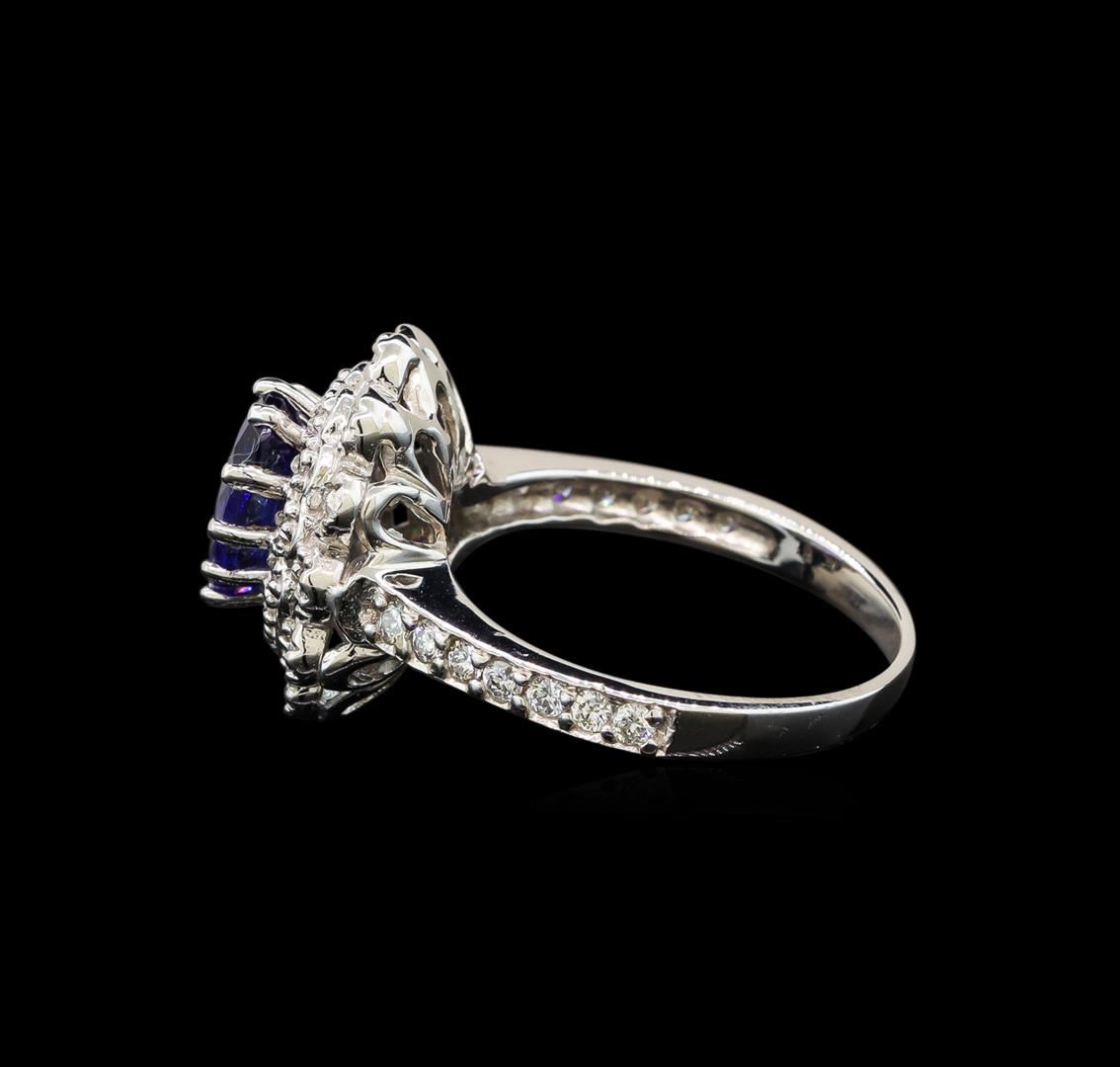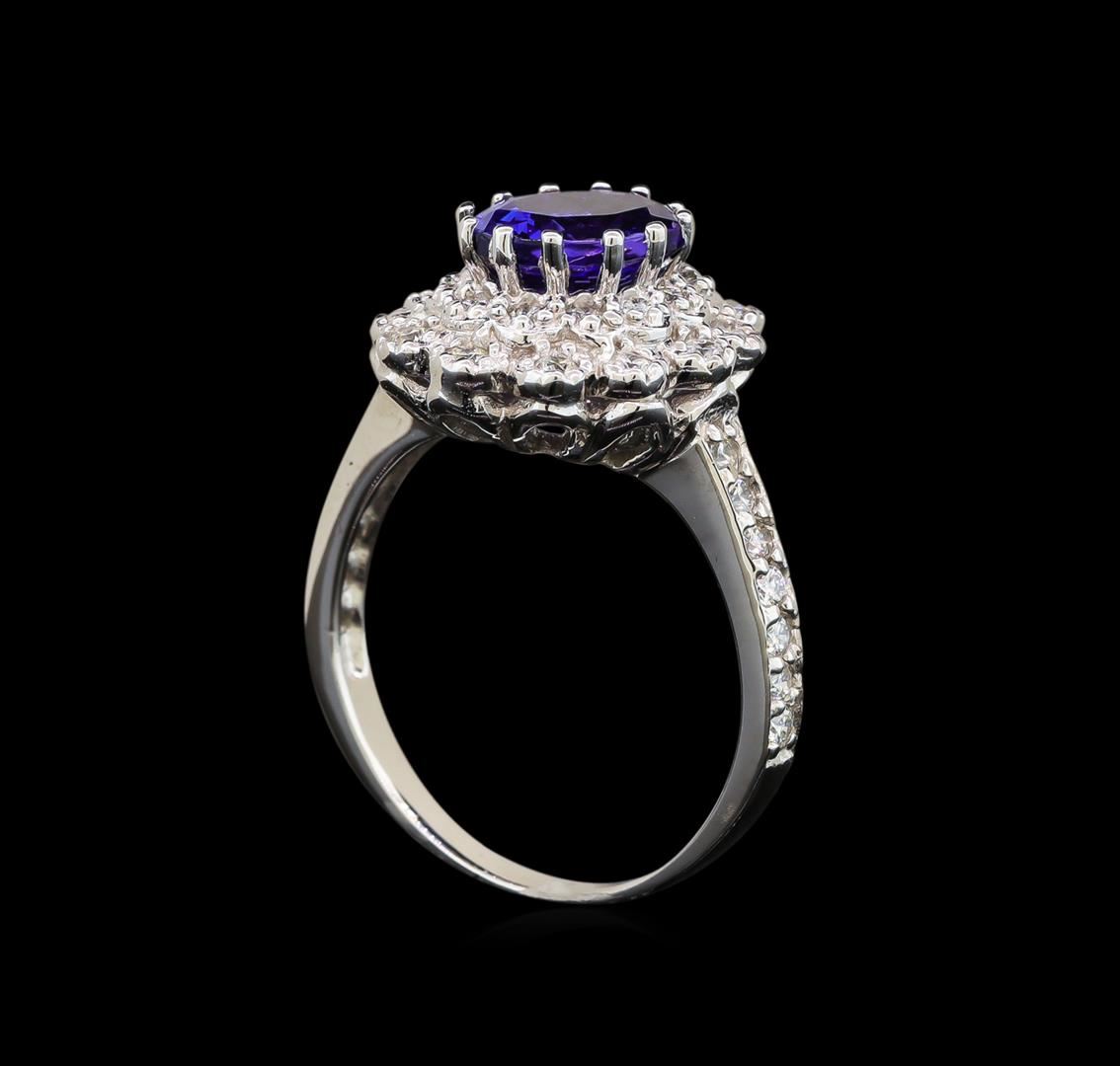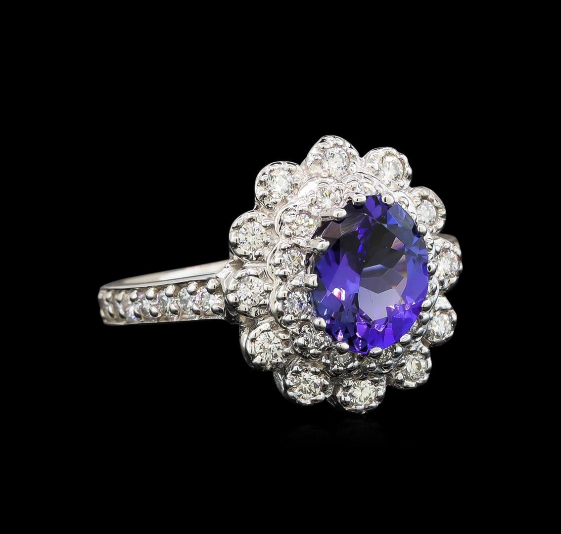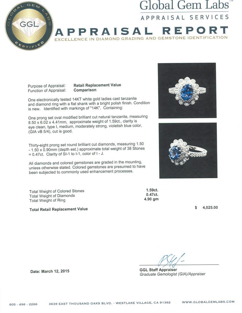 One electronically tested 14KT white gold ladies cast tanzanite and diamond ring with a flat shank with a bright polish finish. Identified with markings of "14K". Condition is new. Containing: One prong set oval modified brilliant cut natural tanzanite, measuring 8.50 x 6.02 x 4.41mm, approximate weight of 1.59ct., clarity is eye clean, type I, medium, moderately strong, violetish blue color, (GIA vB 5/4), cut is good. Thirty-Eight prong set round brilliant cut diamonds, measuring 1.50 - 1.50 x 0.90mm (depth est.) approximate total weight of 38 Stones = 0.47ct. Clarity: SI-1 to I-1. Color: I - J. All diamonds and colored gemstones are graded in the mounting, unless otherwise stated. Colored gemstones are presumed to have been subjected to commonly used enhancement processes. Total Weight of Colored Stones 1.59ct. Total Weight of Diamonds 0.47ct. Total Weight of Ring 4.90 grams. GGL Appraised at $4,025.00.