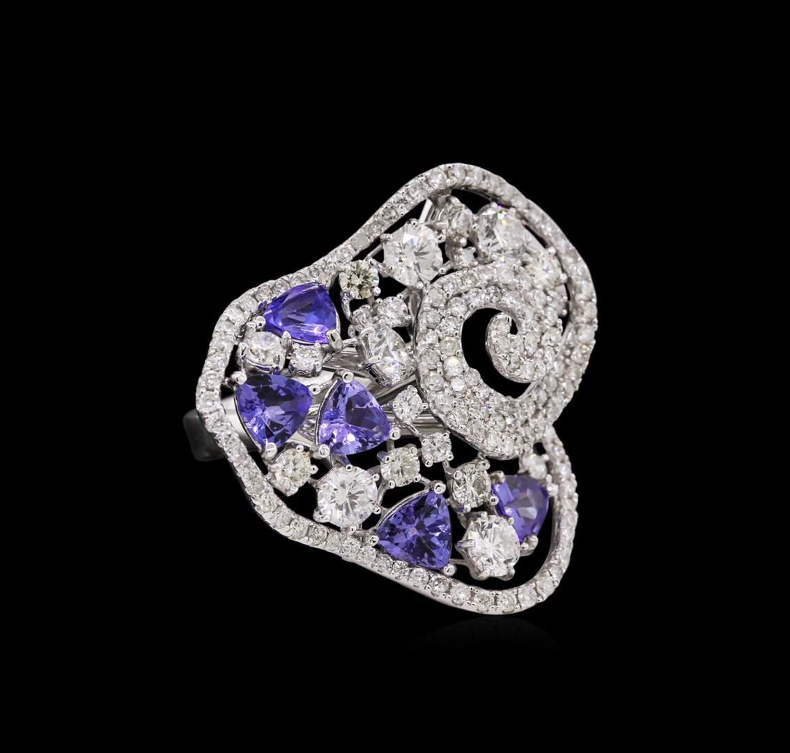 One electronically tested 14KT white gold ladies combination cast & assembled ring with a bright polish finish. Condition is new. Identified with markings of "585". Containing: Five prong set triangle modified brilliant cut natural tanzanites, measuring 4.50 x 4.50 x 2.61mm, approximate. Total Weight of 1.60ct., clarity is eye clean, type I, medium light, very slightly grayish, violet color, (GIA V 4/3), cut is good. One Hundred Thirty-One prong set round brilliant cut diamonds, measuring 1.30 - 1.30 x 0.78mm (depth est.) approximate. Total Weight of 131 Stones = 1.05ct. Clarity: I-1 to I-2. Color: I - J, Cut is Good. Eight prong set round brilliant cut diamonds, measuring 3.00 - 2.00 x 1.50mm (depth est.) approximate. Total Weight of 8 Stones = 0.46ct. Clarity: SI-1 to SI-2. Color: I - J, Cut is Good. Six prong set round brilliant cut diamonds, measuring 4.40 - 4.40 x 2.64mm (depth est.) approximate. Total Weight of 6 Stones = 1.87ct. Clarity: SI-1 to SI-2. Color: J, Cut is Good. Colored gemstones are presumed to have been subjected to commonly used enhancement processes. All diamonds and colored gemstones are graded in the mounting, unless otherwise stated. Total Weight of Colored Stones 1.60ct. Total Weight of Diamonds 3.38ct. Total Weight of Ring 12.70 grams. GGL Appraised at $19,490.00.