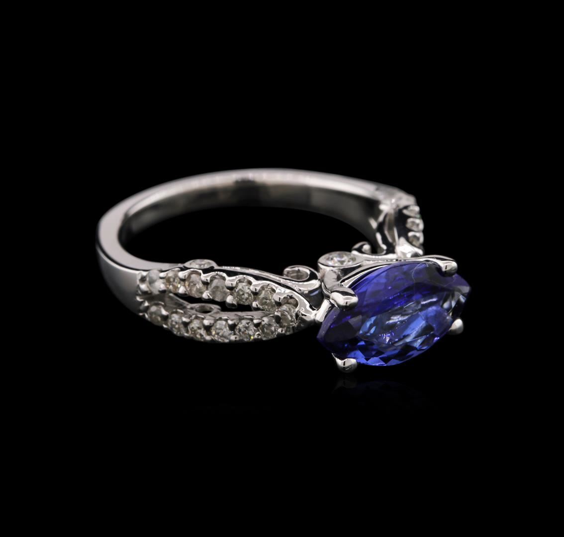 One electronically tested 14KT white gold ladies cast tanzanite and diamond ring with a bright polish finish. Identified with markings of "14K". Condition is new. Containing: One prong set marquise modified brilliant cut natural tanzanite, measuring 11.30 x 6.00 x 3.90mm, approximate weight of 1.60 ct., clarity is eye clean, type I, medium light, very slightly grayish, violet color, (GIA V 4/3), cut is good. Thirty-Four prong set round brilliant cut diamonds, measuring 1.60 - 1.60 x 0.96mm (depth est.) approximate total weight of 34 Stones = 0.44ct. Clarity: I-1 to I-2. Color: I - J, Cut is Good. Colored gemstones are presumed to have been subjected to commonly used enhancement processes. All diamonds and colored gemstones are graded in the mounting, unless otherwise stated. Total Weight of Colored Stones 1.60 ct. Total Weight of Diamonds 0.44ct. Total Weight of Ring 4.00 grams. GGL Appraised.