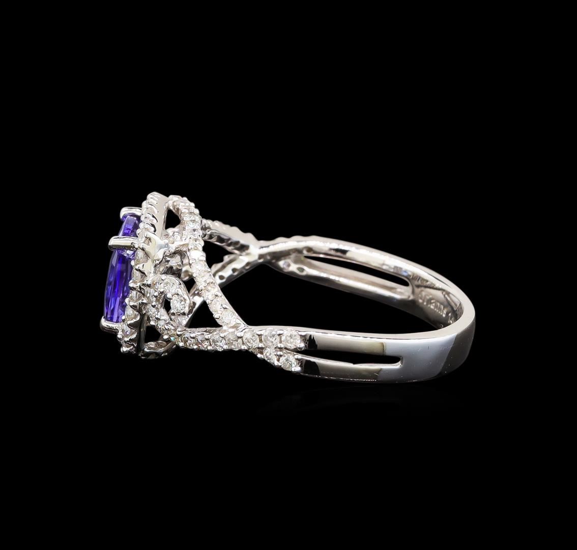One electronically tested 14KT white gold ladies cast tanzanite and diamond ring with a flat shank with a bright polish finish. Trademark is Orianne. Identified with markings of "14K". Condition is new. Containing: One prong set square cushion modified brilliant cut natural tanzanite, measuring 6.64 x 6.65 x 4.66mm, approximate weight of 1.62ct., clarity is eye clean, type I, medium light, very slightly grayish, violet color, (GIA V 4/3), cut is good. Ninety-Two prong set round brilliant cut diamonds, measuring 1.00 - 1.00 x 0.60mm (depth est.) approximate total weight of 92 Stones = 0.33ct. Clarity: I-1 to I-2. Color: I - J. All diamonds and colored gemstones are graded in the mounting, unless otherwise stated. Colored gemstones are presumed to have been subjected to commonly used enhancement processes.. Total Weight of Colored Stones 1.62ct. Total Weight of Diamonds 0.33ct. Total Weight of Ring 3.50 grams. GGL Appraised.