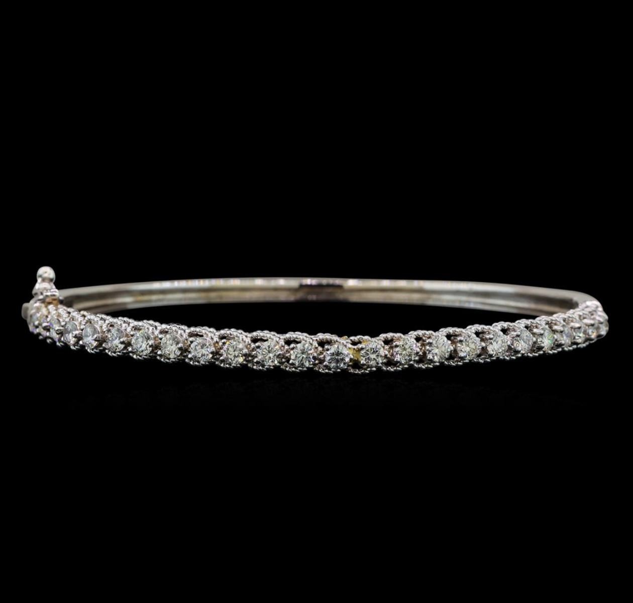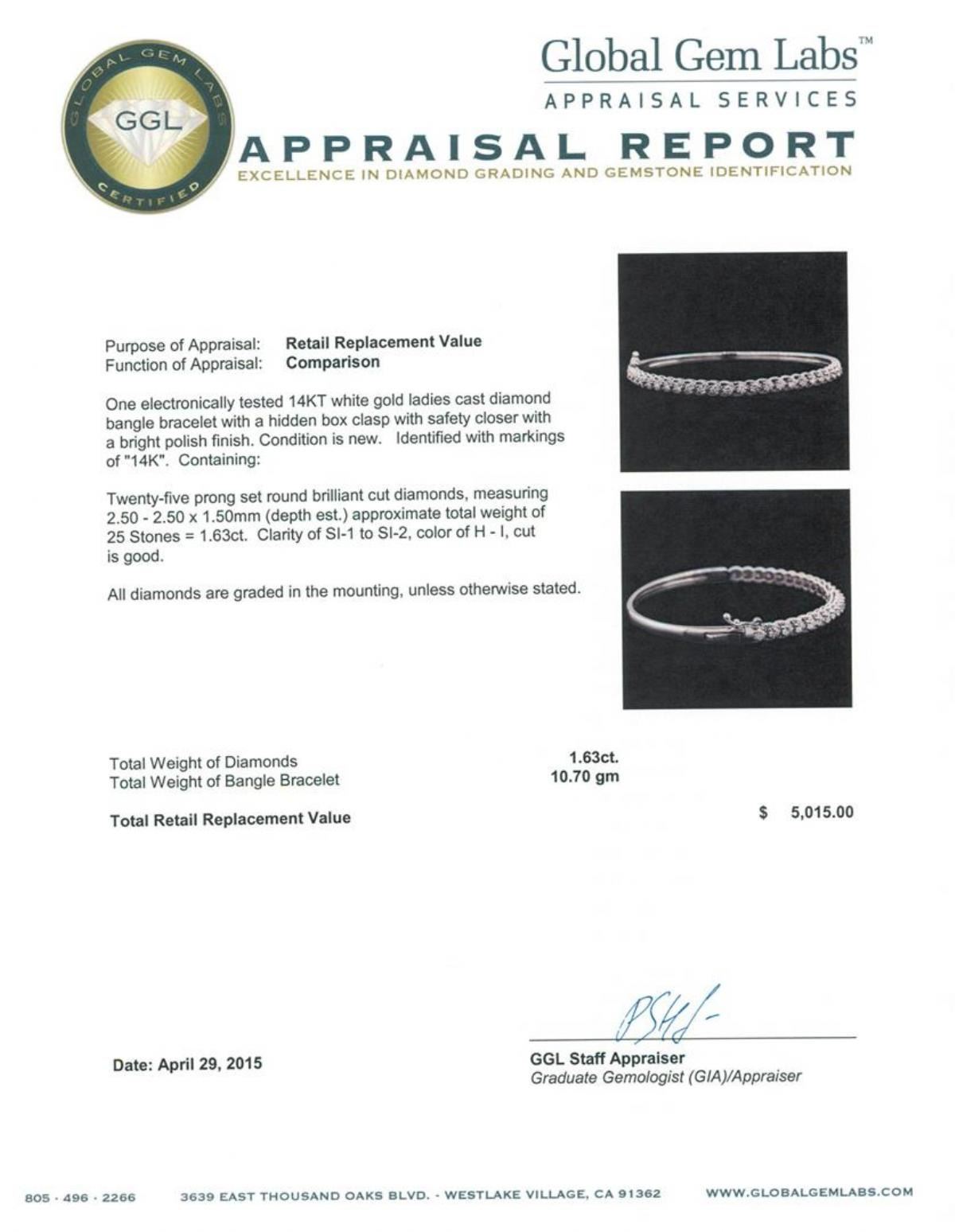 One electronically tested 14KT white gold ladies cast diamond bangle bracelet with a hidden box clasp with safety closer with a bright polish finish. Identified with markings of "14K". Condition is new. Containing: Twenty-Five prong set round brilliant cut diamonds, measuring 2.50 - 2.50 x 1.50mm (depth est.) approximate total weight of 25 Stones = 1.63ct. Clarity: SI-1 to SI-2. Color: H - I, Cut is Good. All diamonds are graded in the mounting, unless otherwise stated. Total Weight of Diamonds 1.63ct. Total Weight of Bangle Bracelet 10.70 grams. GGL Appraised at $5,015.00.