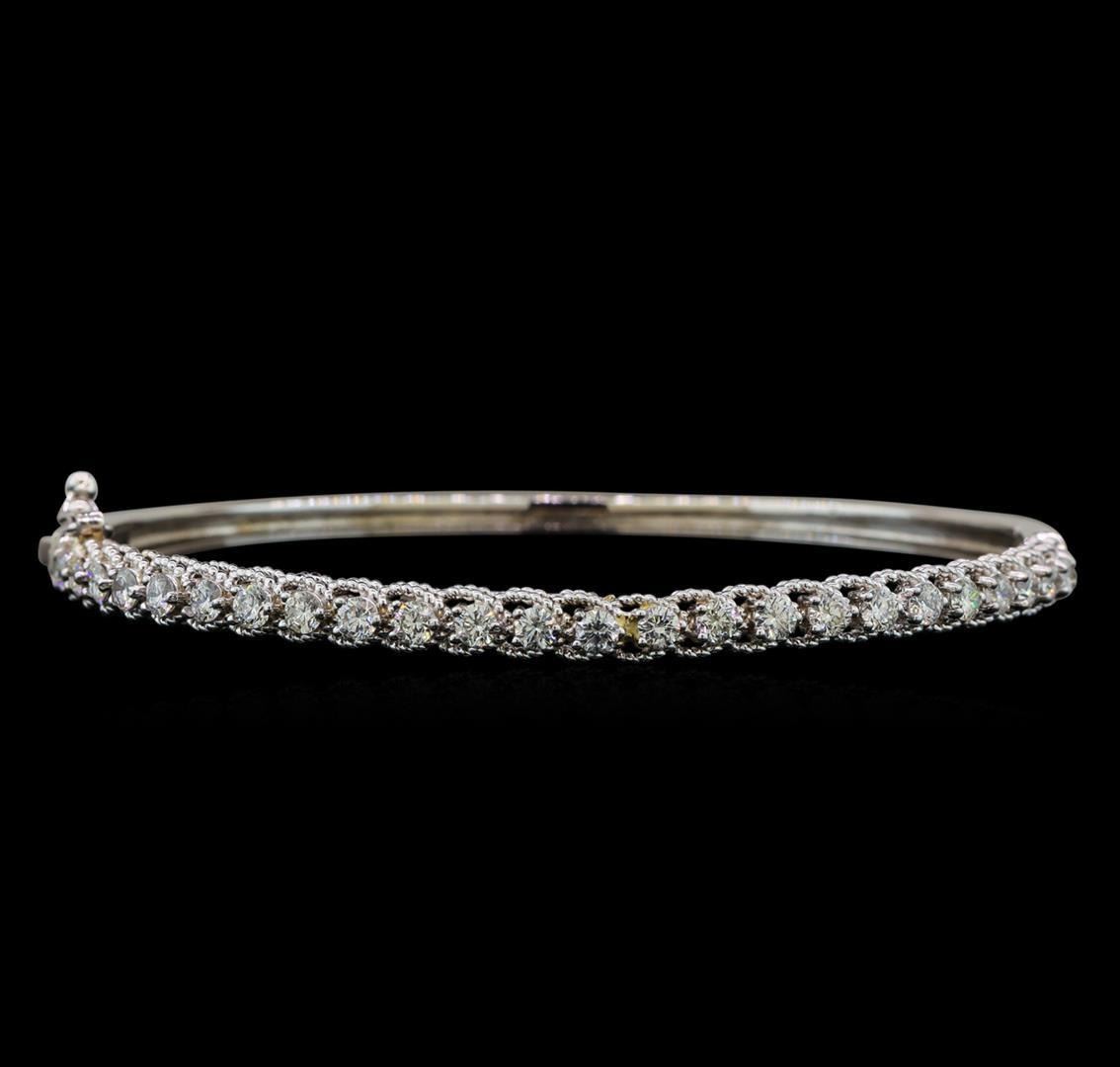 One electronically tested 14KT white gold ladies cast diamond bangle bracelet with a hidden box clasp with safety closer with a bright polish finish. Identified with markings of "14K". Condition is new. Containing: Twenty-Five prong set round brilliant cut diamonds, measuring 2.50 - 2.50 x 1.50mm (depth est.) approximate total weight of 25 Stones = 1.63ct. Clarity: SI-1 to SI-2. Color: H - I, Cut is Good. All diamonds are graded in the mounting, unless otherwise stated. Total Weight of Diamonds 1.63ct. Total Weight of Bangle Bracelet 10.70 grams. GGL Appraised.