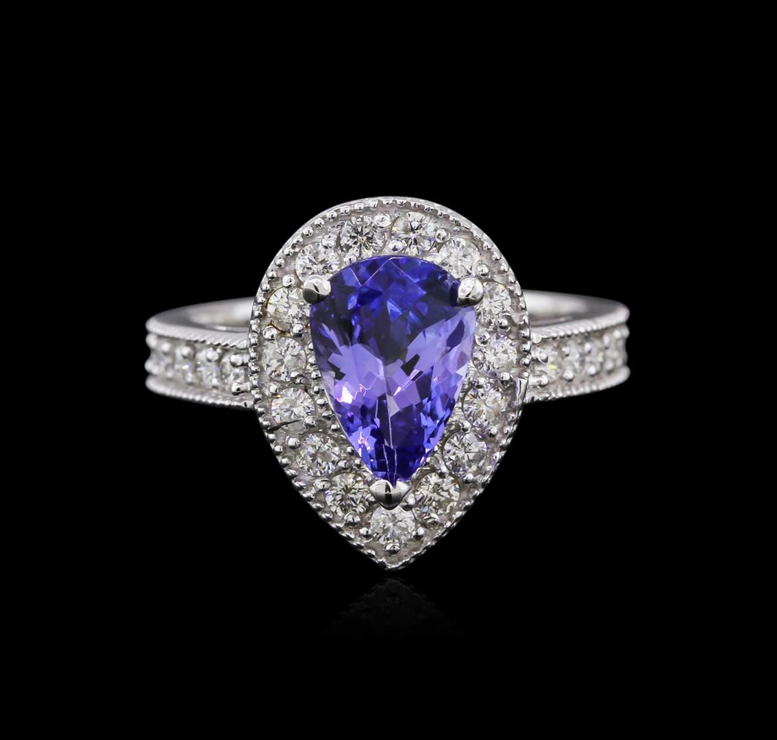 One electronically tested 14KT white gold ladies cast tanzanite and diamond ring with a bright polish finish. Identified with markings of "14K". Condition is new. Containing: One prong set pear modified brilliant cut natural tanzanite, measuring 9.00 x 6.83 x 3.95mm, approximate weight of 1.63ct., clarity is eye clean, type I, medium, very slightly grayish, violet color, (GIA V 5/3), cut is good. Twenty-Seven prong set round brilliant cut diamonds, measuring 1.50 - 1.50 x 0.90mm (depth est.) approximate total weight of 27 Stones = 0.33ct. Clarity: SI-2 to I-1. Color: I - J, Cut is Good. All diamonds and colored gemstones are graded in the mounting, unless otherwise stated. Colored gemstones are presumed to have been subjected to commonly used enhancement processes. Total Weight of Colored Stones 1.63ct. Total Weight of Diamonds 0.33ct. Total Weight of Ring 5.30 grams. GGL Appraised at $2,635.00.