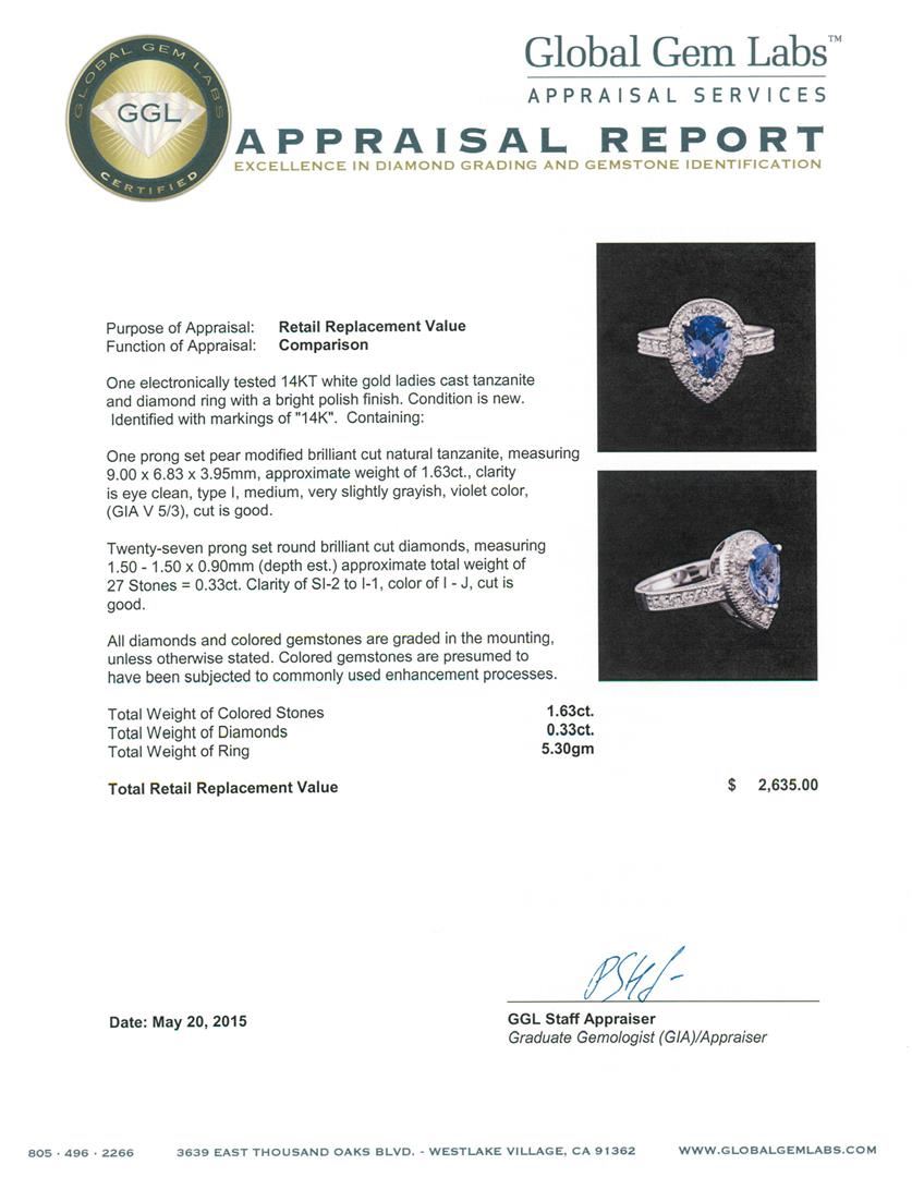 One electronically tested 14KT white gold ladies cast tanzanite and diamond ring with a bright polish finish. Identified with markings of "14K". Condition is new. Containing: One prong set pear modified brilliant cut natural tanzanite, measuring 9.00 x 6.83 x 3.95mm, approximate weight of 1.63ct., clarity is eye clean, type I, medium, very slightly grayish, violet color, (GIA V 5/3), cut is good. Twenty-Seven prong set round brilliant cut diamonds, measuring 1.50 - 1.50 x 0.90mm (depth est.) approximate total weight of 27 Stones = 0.33ct. Clarity: SI-2 to I-1. Color: I - J, Cut is Good. All diamonds and colored gemstones are graded in the mounting, unless otherwise stated. Colored gemstones are presumed to have been subjected to commonly used enhancement processes. Total Weight of Colored Stones 1.63ct. Total Weight of Diamonds 0.33ct. Total Weight of Ring 5.30 grams.