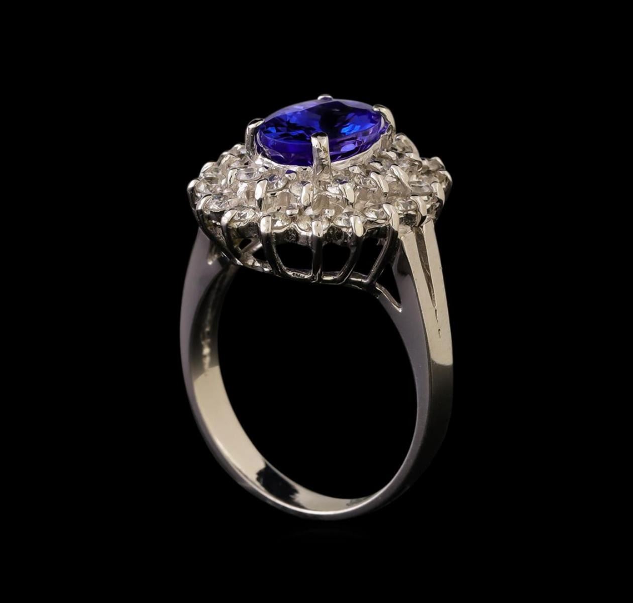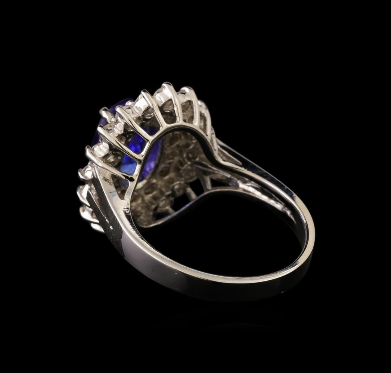 One electronically tested 14KT white gold ladies cast tanzanite & diamond ring with a bright finish. The featured tanzanite is set within a tiered diamond bezel, supported by a ribbed under gallery, completed by a three millimeter wide band. Identified with markings of "14K". Condition is new, good workmanship. Containing: One prong set oval brilliant cut natural tanzanite, measuring 9.00 x 6.00 x 4.38mm, approximate weight of 1.65ct., clarity is eye clean, type I, dark, slightly grayish, bluish violet color, (GIA bV 7/2), cut is good. Transmitting light with no distortion, transparent. Graded in the setting. Tanzanite is a very rare gemstone that is only found in the country of Tanzania. Originally discovered in 1967. Tiffany & Company, named the stone Tanzanite. It is found in the Usumburu Mountains that border the Umba Valley of northern Tanzania. Tanzanite occurs in gray, brown, violet, blue, reddish-purple, & green. The gem is interesting because of its exceptional pleochroism. Rotated in different directions a tanzanite will exhibit multiple changes of color. Tanzanite has a low tolerance to ultrasonic cleaning, and should not be cleaned using this method. Thirty-Two prong set round brilliant cut diamonds, measuring 2.00 - 1.70 x 1.11mm (depth est.) approximate total weight of 32 Stones = 0.76ct. Graded in the setting. Clarity: SI-2 to I-2. Color: H - I. Total Weight of Colored Stones 1.65ct. Total Weight of Diamonds 0.76ct. Total Weight of Ring 5.61 grams. AIG Appraised.