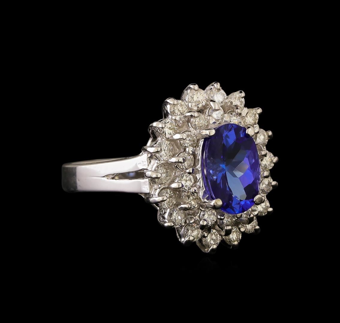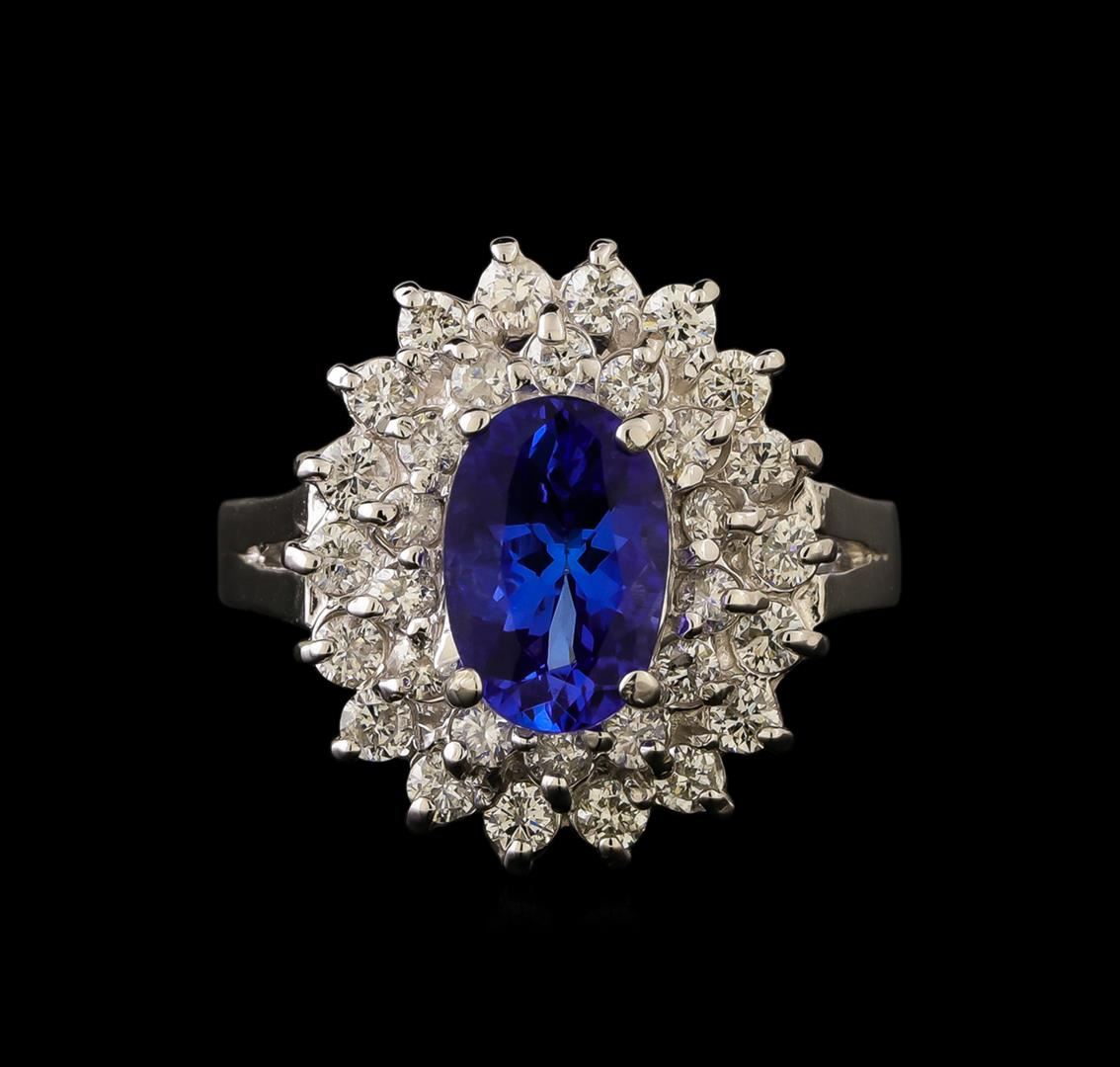 One electronically tested 14KT white gold ladies cast tanzanite & diamond ring with a bright finish. The featured tanzanite is set within a tiered diamond bezel, supported by a ribbed under gallery, completed by a three millimeter wide band. Identified with markings of "14K". Condition is new, good workmanship. Containing: One prong set oval brilliant cut natural tanzanite, measuring 9.00 x 6.00 x 4.38mm, approximate weight of 1.65ct., clarity is eye clean, type I, dark, slightly grayish, bluish violet color, (GIA bV 7/2), cut is good. Transmitting light with no distortion, transparent. Graded in the setting. Tanzanite is a very rare gemstone that is only found in the country of Tanzania. Originally discovered in 1967. Tiffany & Company, named the stone Tanzanite. It is found in the Usumburu Mountains that border the Umba Valley of northern Tanzania. Tanzanite occurs in gray, brown, violet, blue, reddish-purple, & green. The gem is interesting because of its exceptional pleochroism. Rotated in different directions a tanzanite will exhibit multiple changes of color. Tanzanite has a low tolerance to ultrasonic cleaning, and should not be cleaned using this method. Thirty-Two prong set round brilliant cut diamonds, measuring 2.00 - 1.70 x 1.11mm (depth est.) approximate total weight of 32 Stones = 0.76ct. Graded in the setting. Clarity: SI-2 to I-2. Color: H - I. Total Weight of Colored Stones 1.65ct. Total Weight of Diamonds 0.76ct. Total Weight of Ring 5.61 grams. AIG Appraised.