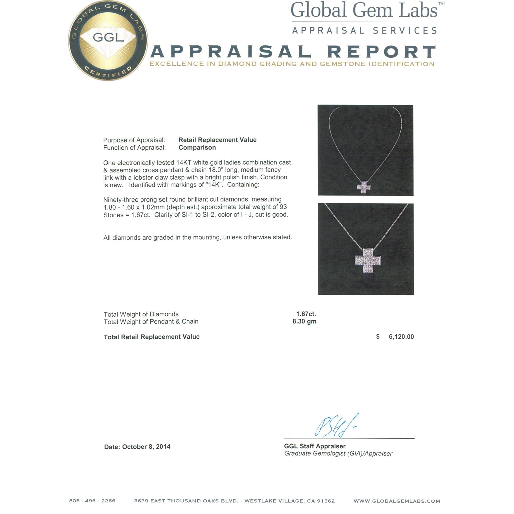 One electronically tested 14KT white gold ladies combination cast & assembled cross pendant & chain 18.0" long, medium fancy link with a lobster claw clasp with a bright polish finish. Identified with markings of "14K". Condition is new. Containing: Ninety-Three prong set round brilliant cut diamonds, measuring 1.80 - 1.60 x 1.02mm (depth est.) approximate total weight of 93 Stones = 1.67ct. Clarity: SI-1 to SI-2. Color: I - J, Cut is Good. All diamonds are graded in the mounting, unless otherwise stated. Total Weight of Diamonds 1.67ct. Total Weight of Pendant & Chain 8.30 grams. GGL Appraised.