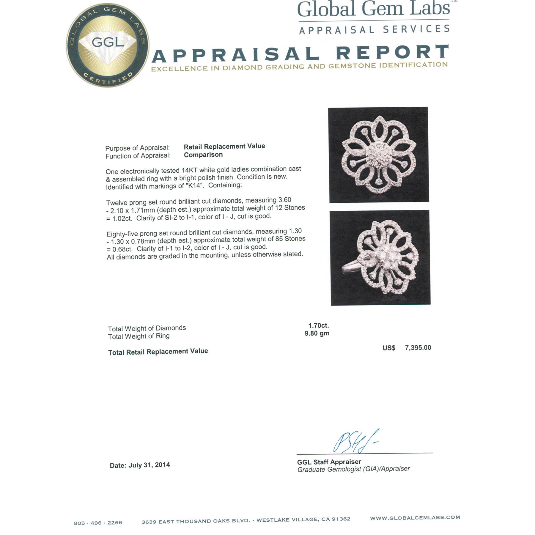 One electronically tested 14KT white gold ladies combination cast & assembled ring with a bright polish finish. Condition is new. Identified with markings of "K14". Containing: Twelve prong set round brilliant cut diamonds, measuring 3.60 - 2.10 x 1.71mm (depth est.) approximate. Total Weight of 12 Stones = 1.02ct. Clarity: SI-2 to I-1. Color: I - J, Cut is Good. Eighty-Five prong set round brilliant cut diamonds, measuring 1.30 - 1.30 x 0.78mm (depth est.) approximate. Total Weight of 85 Stones = 0.68ct. Clarity: I-1 to I-2. Color: I - J, Cut is Good. All diamonds are graded in the mounting, unless otherwise stated. Total Weight of Diamonds 1.70ct. Total Weight of Ring 9.80 grams. GGL Appraised at $7,395.00.