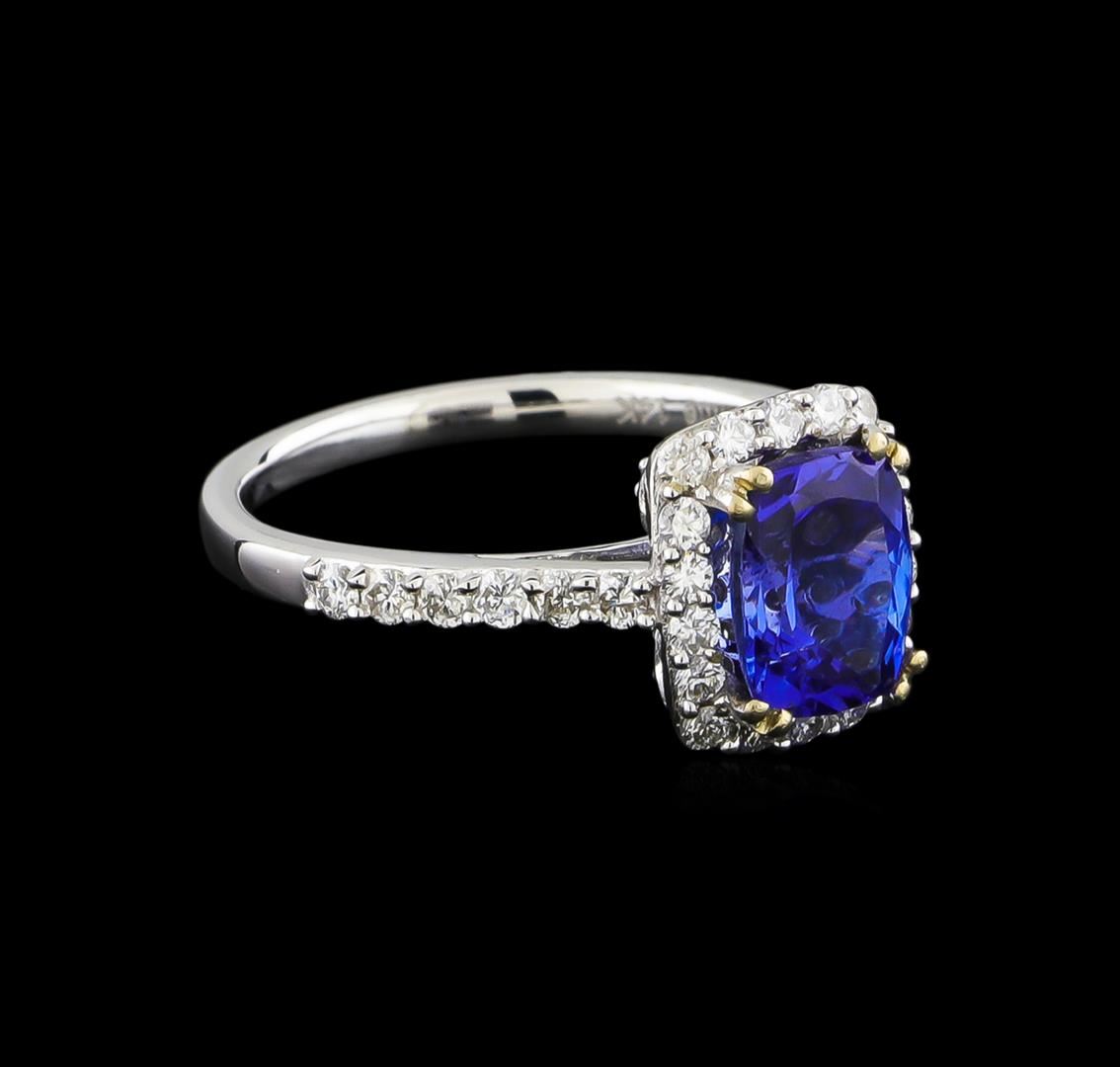 One electronically tested 14KT white gold ladies cast tanzanite and diamond ring with a bright polish finish. The featured tanzanite is set within a diamond ring supported by diamond set shoulders, completed by a one and one-half millimeter wide band. Trademark is Orianne. Identified with markings of "14K". Condition is new, good workmanship. Containing: One prong set rectangular cushion brilliant cut natural tanzanite, measuring 8.10 x 6.20 x 4.00mm, 8% bulge factor, approximate weight of 1.71ct., clarity is eye clean, type I, medium dark, very slightly grayish, violetish blue color, (GIA vB 6/3), cut is good. Transmitting light with no distortion, transparent. Graded in the setting. Tanzanite is a very rare gemstone that is only found in the country of Tanzania. Originally discovered in 1967. Tiffany & Company, named the stone Tanzanite. It is found in the Usumburu Mountains that border the Umba Valley of northern Tanzania. Tanzanite occurs in gray, brown, violet, blue, reddish-purple, & green. The gem is interesting because of its exceptional pleochroism. Rotated in different directions a tanzanite will exhibit multiple changes of color. Tanzanite has a low tolerance to ultrasonic cleaning, and should not be cleaned using this method. Fifty-Four prong set round brilliant cut diamonds, measuring 1.70 - 1.60 x 0.99mm (depth est.) approximate total weight of 54 Stones = 0.98ct. Graded in the setting. Clarity: SI-1 to I-1. Color: H - J. Total Weight of Colored Stones 1.71ct. Total Weight of Diamonds 0.98ct. Total Weight of Ring 3.56 grams. AIG Appraised.