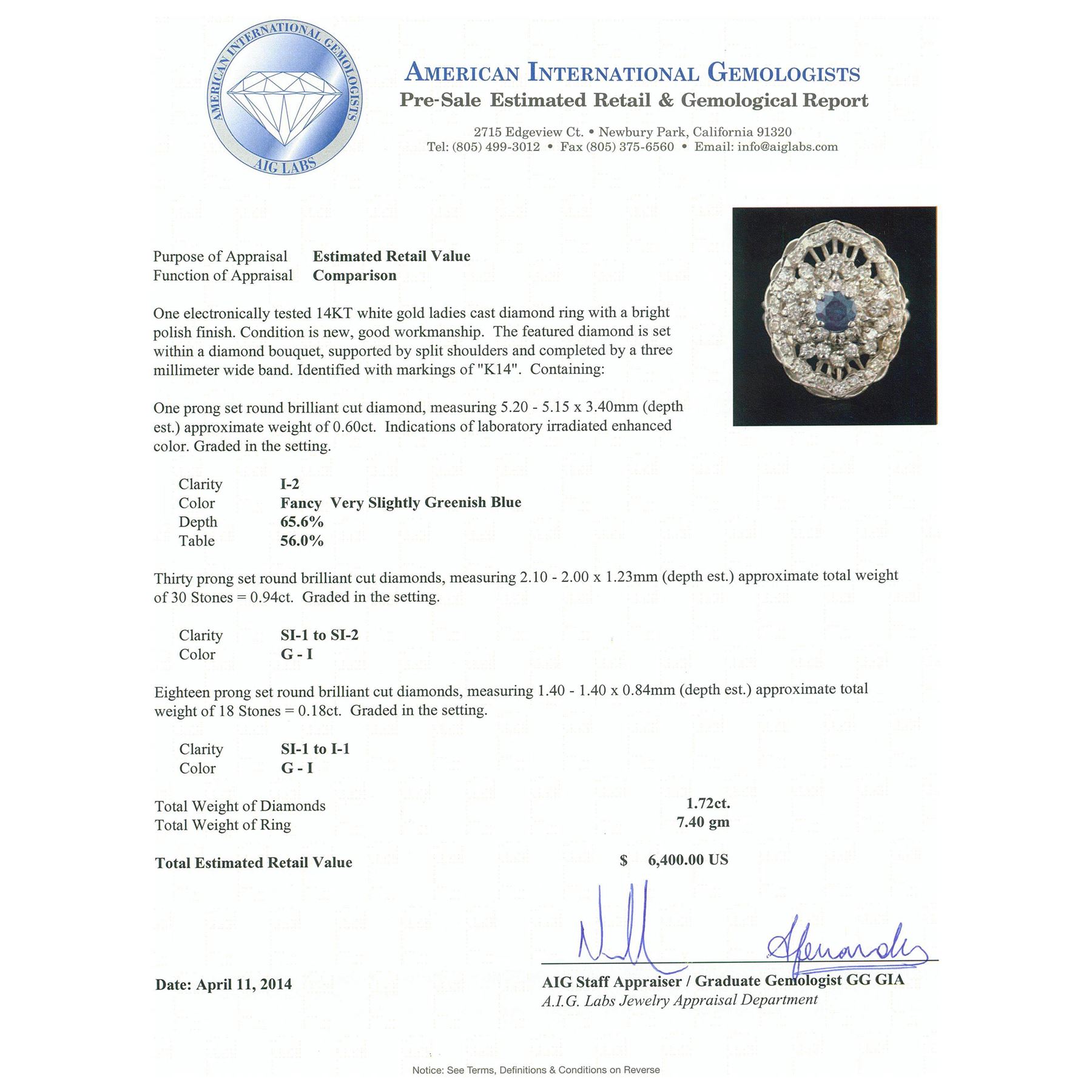 One electronically tested 14KT white gold ladies cast diamond ring with a bright polish finish. Condition is new, good workmanship. The featured diamond is set within a diamond bouquet, supported by split shoulders and completed by a three millimeter wide band. Identified with markings of "K14". Containing: One prong set round brilliant cut diamond, measuring 5.20 - 5.15 x 3.40mm (depth est.) approximate weight of 0.60ct. Indications of laboratory irradiated enhanced color. Graded in the setting. Clarity: I-2. Depth: 65.6%. Table 56.0%. Thirty prong set round brilliant cut diamonds, measuring 2.10 - 2.00 x 1.23mm (depth est.) approximate. Total Weight of 30 Stones = 0.94ct. Graded in the setting. Clarity: SI-1 to SI-2. Color: G - I Eighteen prong set round brilliant cut diamonds, measuring 1.40 - 1.40 x 0.84mm (depth est.) approximate. Total Weight of 18 Stones = 0.18ct. Graded in the setting. Clarity: SI-1 to I-1. Color: G - I. Total Weight of Diamonds 1.72ct. Total Weight of Ring 7.40 grams. AIG Appraised at $6,400.00.