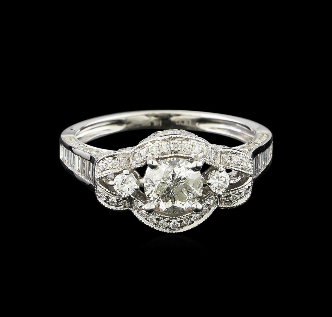 One electronically tested 14KT white gold ladies combination cast & assembled engagement ring with a flat shank with a bright polish finish. Identified with markings of "14K". Condition is new. Containing: One prong set round brilliant cut diamond, measuring 5.45 - 5.40 x 3.09mm (depth est.) approximate weight of 0.56ct. Clarity: I-2. Color: J, Cut is Good. Two prong set round brilliant cut diamonds, measuring 2.00 - 2.00 x 1.20mm (depth est.) approximate total weight of 2 Stones = 0.06ct. Clarity: I-1. Color: I, Cut is Good. Ninety-Eight prong set round brilliant cut diamonds, measuring 1.30 - 1.30 x 0.78mm (depth est.) approximate total weight of 98 Stones = 0.78ct. Clarity: SI-2 to I-2. Color: I - J, Cut is Good. Eighteen channel set baguette cut diamonds, measuring from 1.50 x 1.10 x 0.94mm (depth est.) to 2.00 x 1.20 x 1.02mm (depth est.) approximate total weight of 18 Stones = 0.32ct. Clarity: SI-1. Color: I - J, Cut is Good. All diamonds are graded in the mounting, unless otherwise stated. Total Weight of Diamonds 1.72ct. Total Weight of Ring 3.30 grams. GGL Appraised.